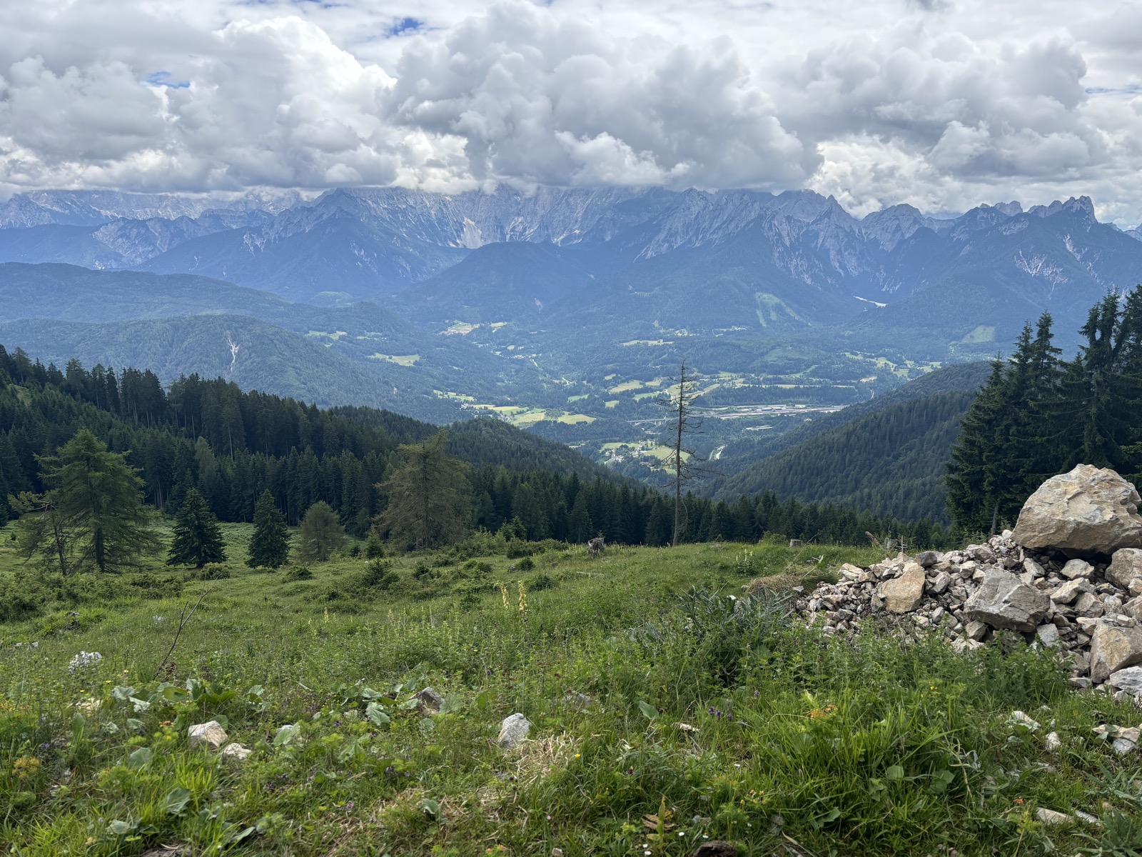 A teď začíná závěrečné stoupání v lese. Je to místy brutálně strmé. Kopíruju státní hranici. Ale nějak mi uniká smysl. Nic zajímavého tu není. Podle mě ta stezka měla skončit někde dřív. Höhenweg my ass. No ale nějak se vydrápu až nahoru. Je 14 hodin. Je tu aspoň hezký výhled do krajiny. A taky nějaké chatky a pramen vody a posezení. Takže dávám pauzu.