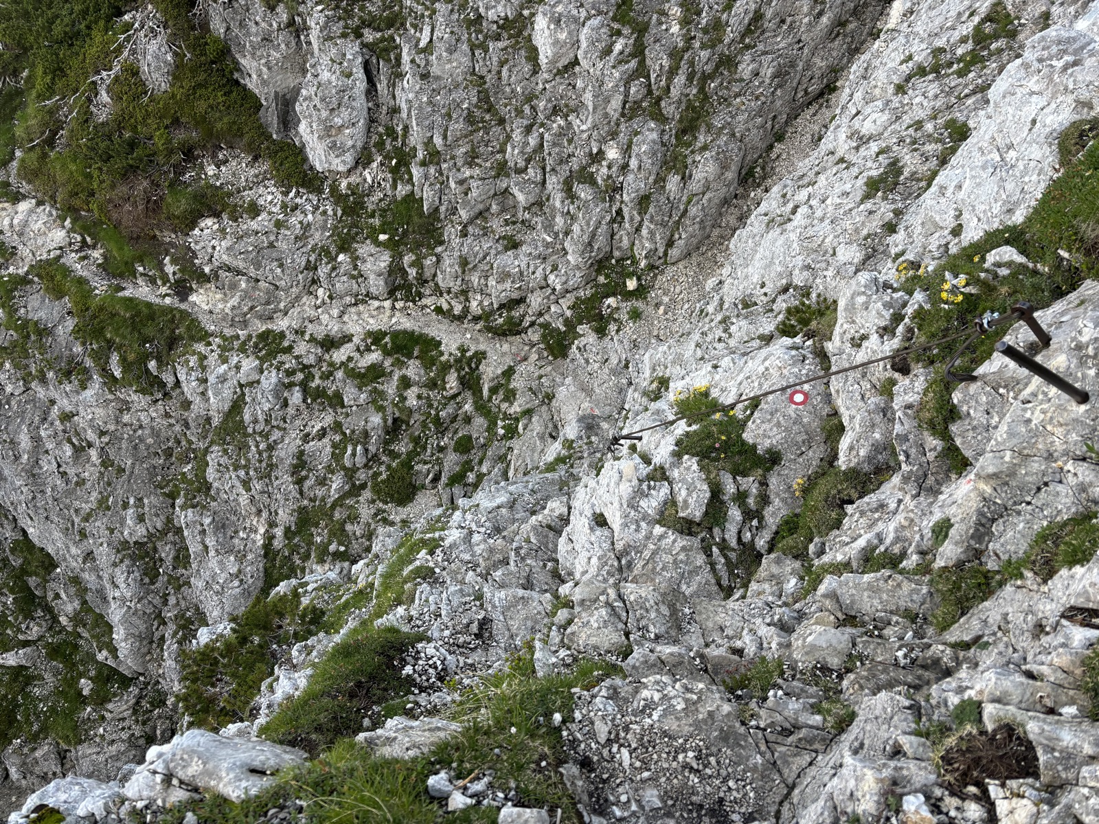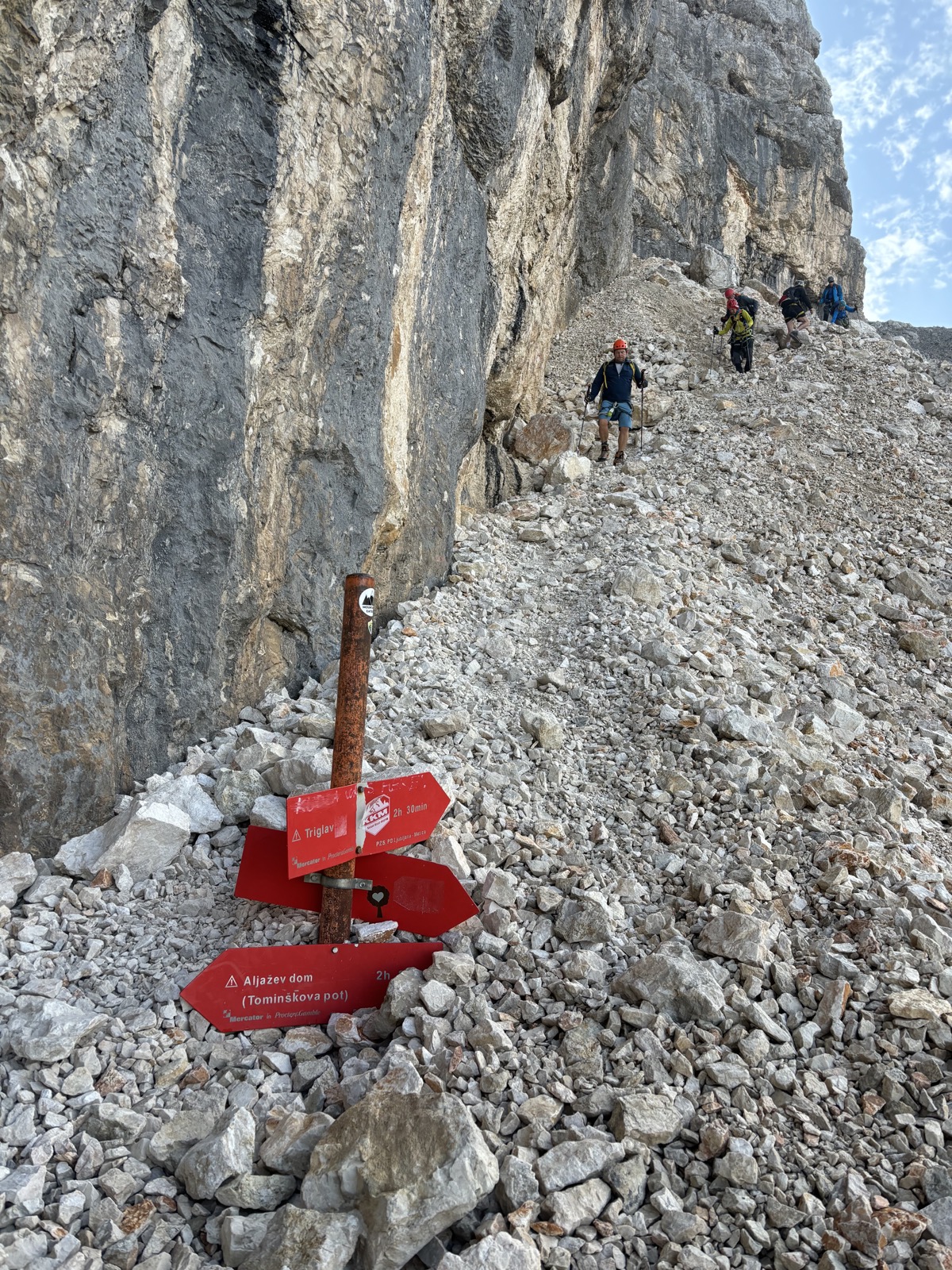 V 8:06 dojdu k další chatě – Dom Valentina Staniča pod Triglavom. Ani tady není voda. O 20 minut později jsem na rozcestí nad údolím Vrata. Mám dvě možnosti. Buď jít dolů normální cestou, anebo přes via ferratu. Normální cestou jsem šel v roce 2020 (ale nahoru), volím tedy via ferratu, snad to nebude moc náročné. Je to hezká cesta! Akorát místy dost strmá. Potkávám docela dost lidí, co jdou nahoru. Postupně se dostávám do lesa.