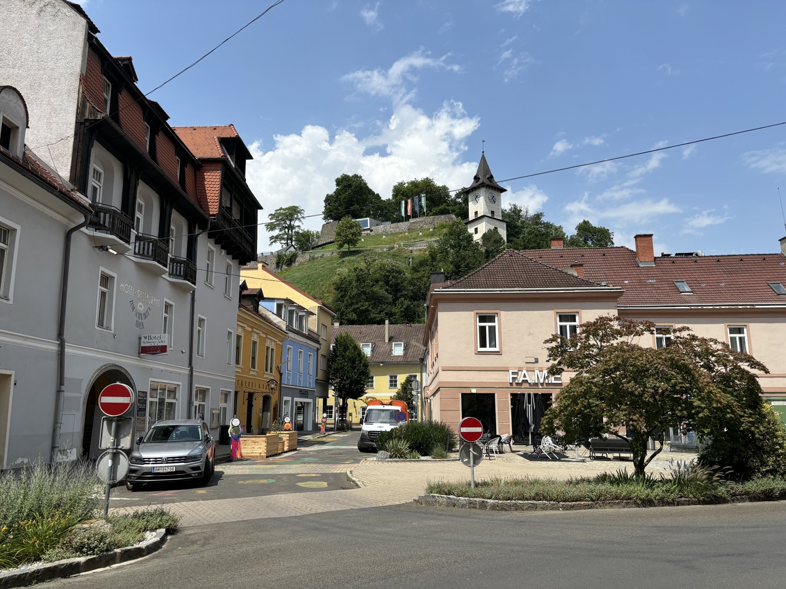 Pak jedu busem, ve Föderlach přestoupím na vlak, ve Friesachu na další. V Brucku mám chvíli čas (zdá se, že mi ujel můj vlak, tak čekám na další, už přesně nevím).