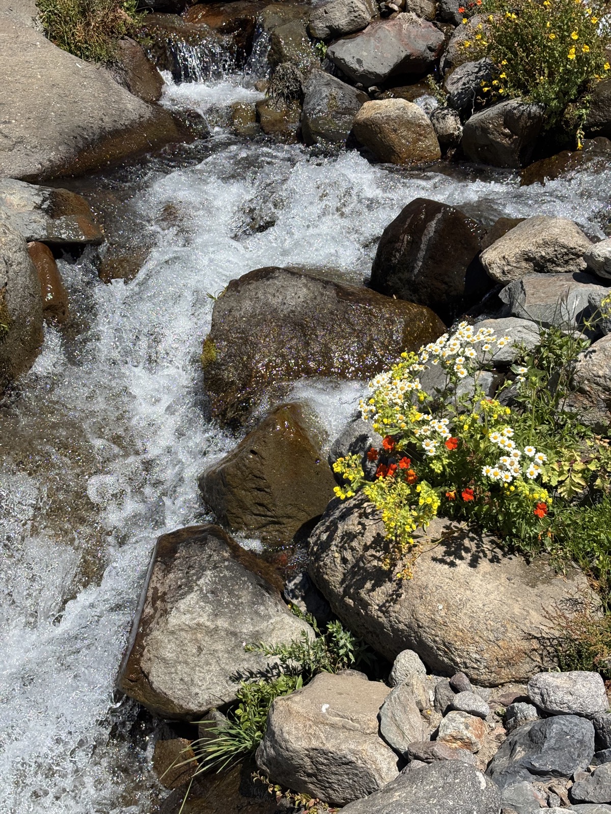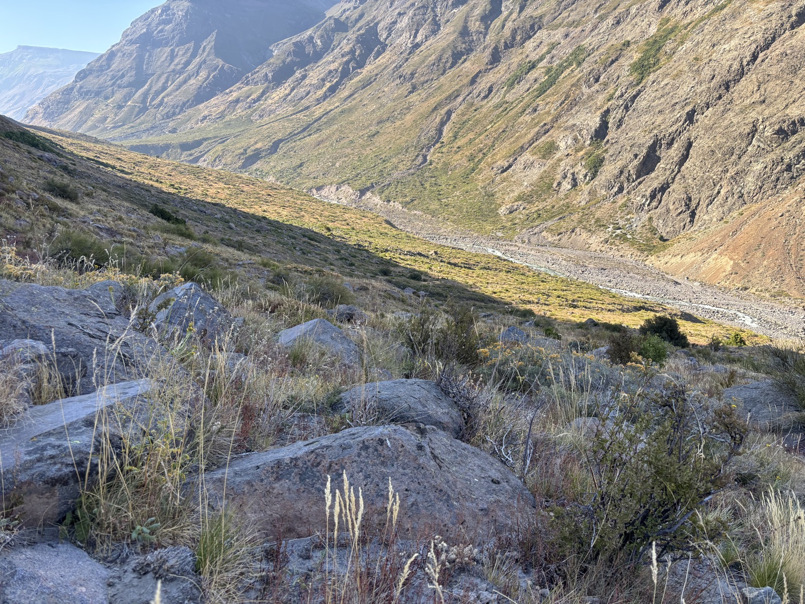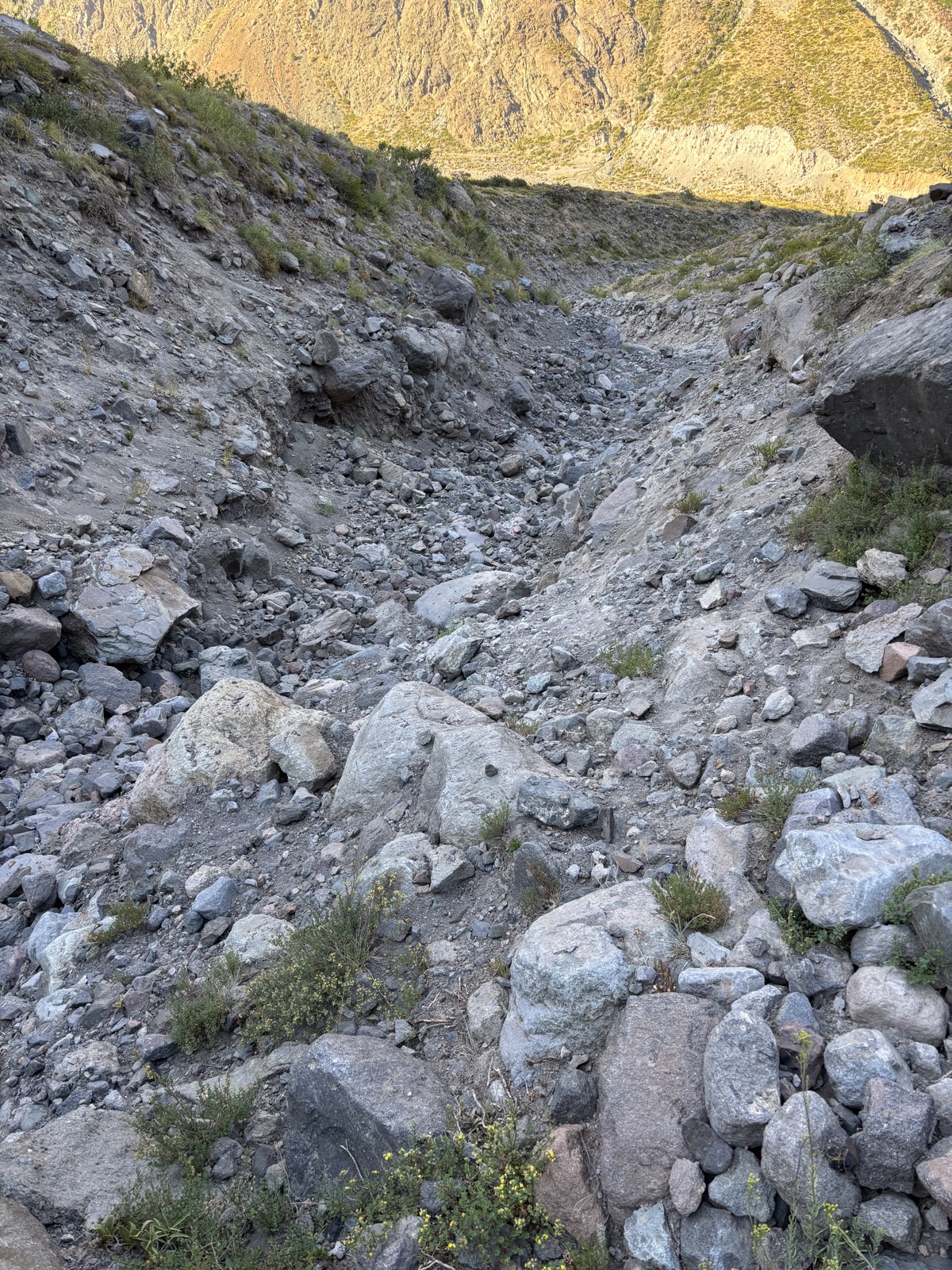 Prvotní prudké klesání bylo nakonec nejmenším problémem. Horší bylo to, co následovalo. Takový travers ve svazích nad řekou. Místy se začla objevovat různá vegetace. Bylo to opravdu náročné. A pak jsem došel k hustému lesíku nízkých stromů. Tak jsem se kus vrátil a rozhodl se, že zkusím jedním vyschlým řečištěm slézt až k řece – třeba bude terén u řeky nakonec rychlejší. Překonal jsem pár prudkých úseků a slezl dolů. Chvilku jdu podél řeky a pak to vidím – sráz, který vede až dolů k řece. Takze buď přebrodím – na druhé straně je pěšina – anebo budu muset někde vylézt zpět tak 10 metrů na okraj srázu. Brod chvilku zvažuju, ale je to fakt dost divoká řeka. Takže se vyškrábu zpět nahoru. Je to s vypětím sil, ale podaří se.