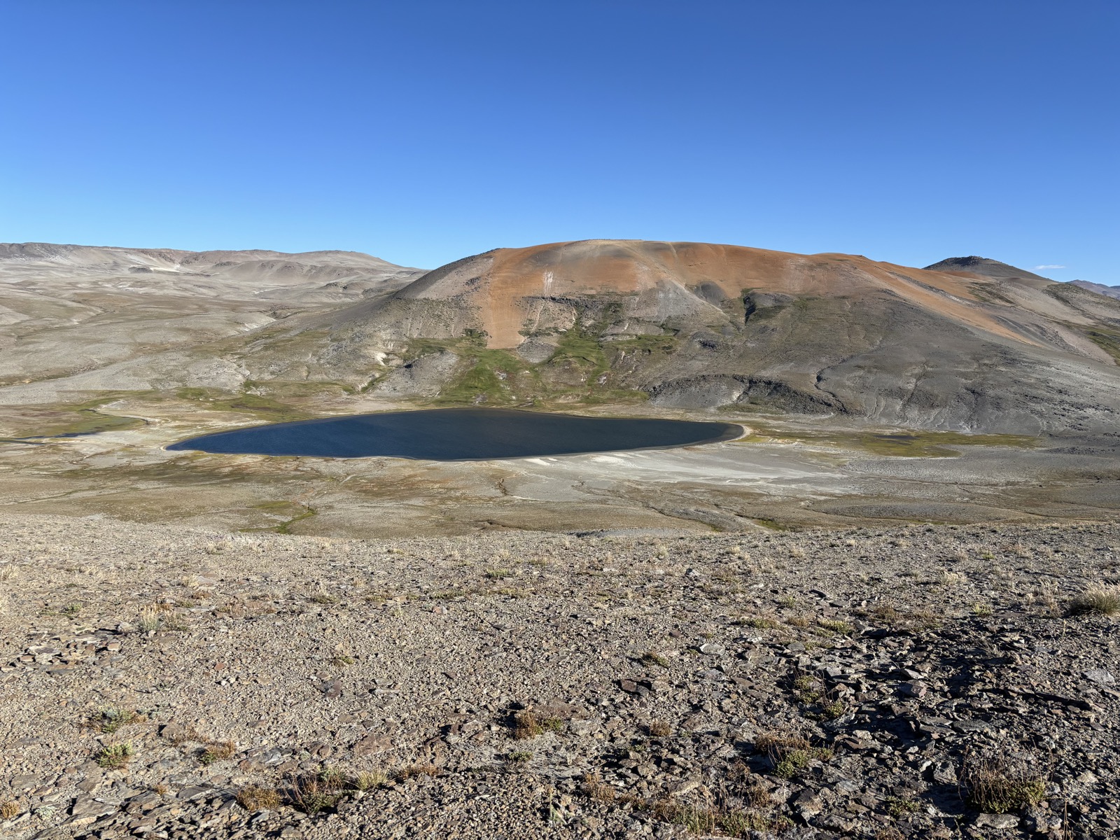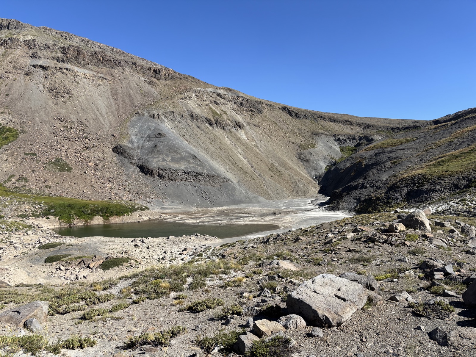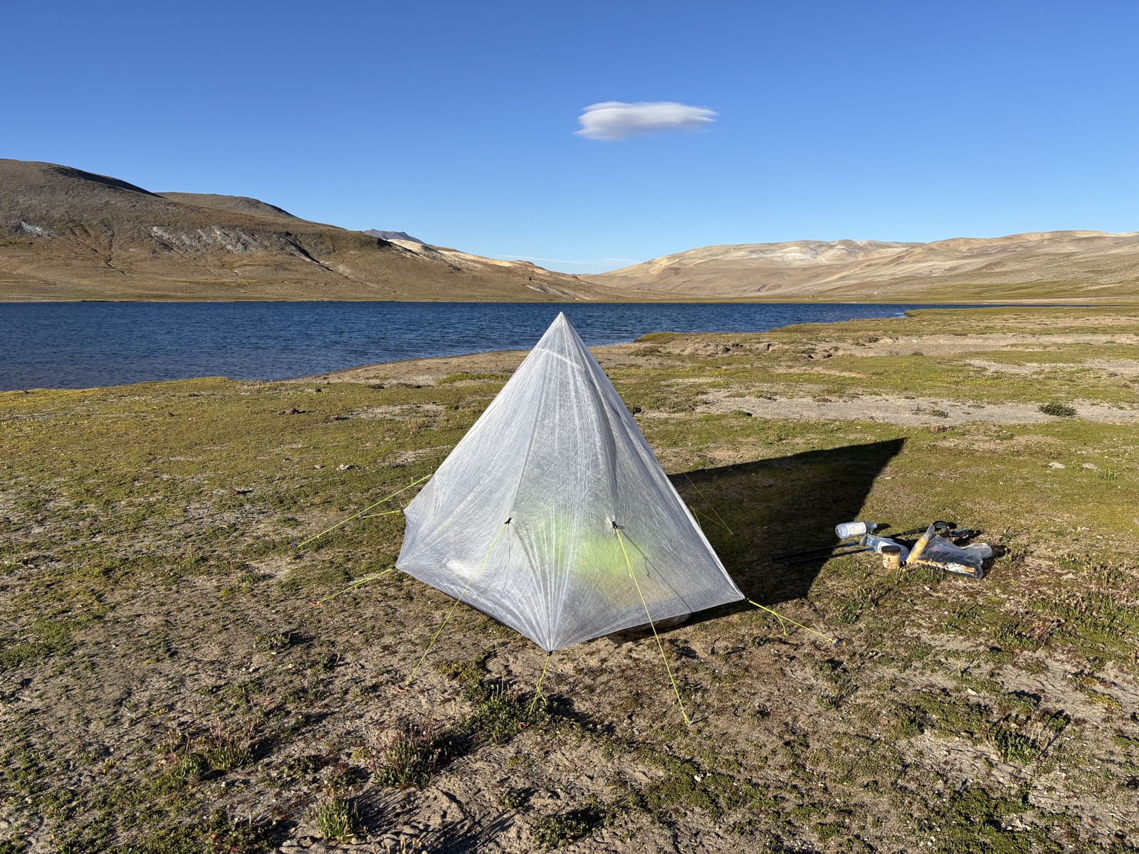 U jezera jsem tak 18:45. Zvládl jsem to. Odsud už by měla vést stezka. Mám toho dnes dost. Ještě bych zvládl slézt dolů k další řece (kterou budu brodit), třeba by tam bylo závětří, ale spíš ne a kdo ví, jestli by tam vůbec bylo místo na kemp. Raději se utábořím zde. Je to krásné místo, akorát se bojím větru. Docela dost fouká. A nejsou tu vůbec šutry, tak snad bude půda dost tvrdá, aby to kolíky udržely.