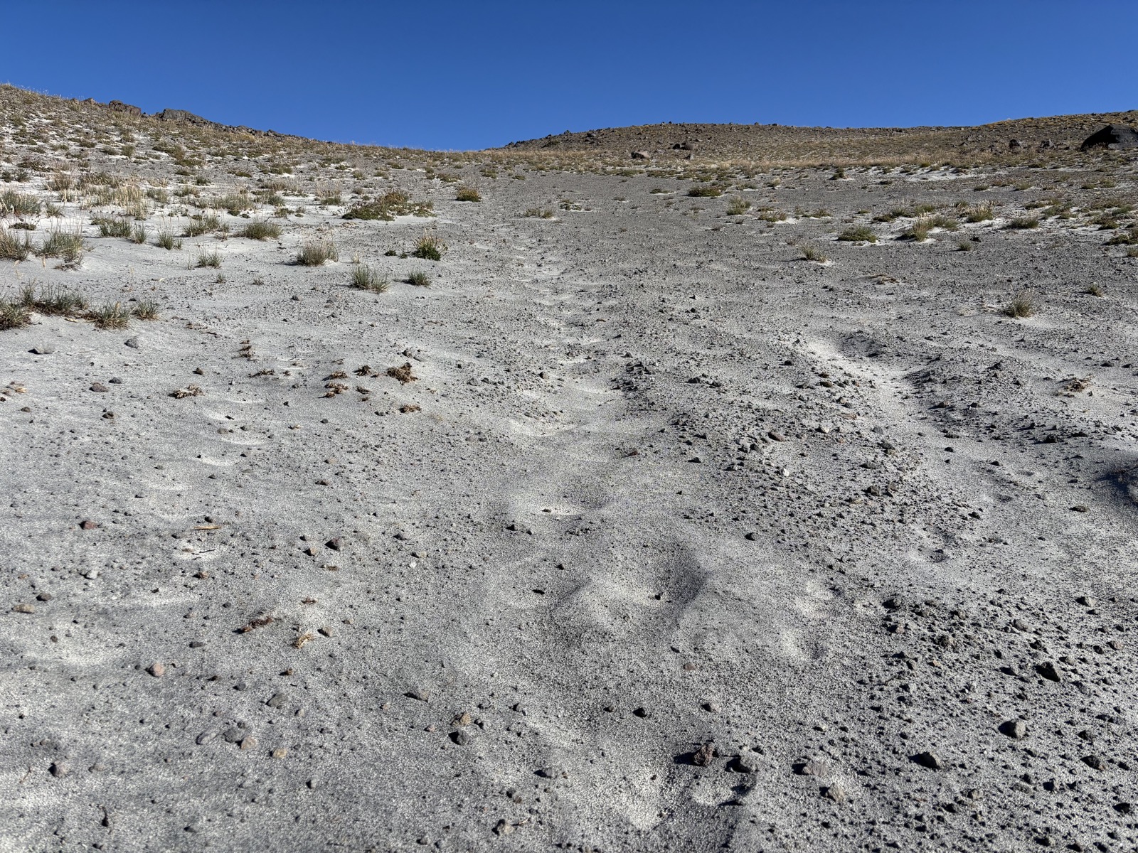 Pak se dostanu už na dohled sedlu. Stoupání je mírné a půda je písečná či sopečná. Ploužím se pomalu, ale jistě.