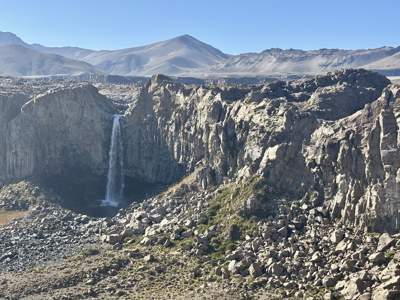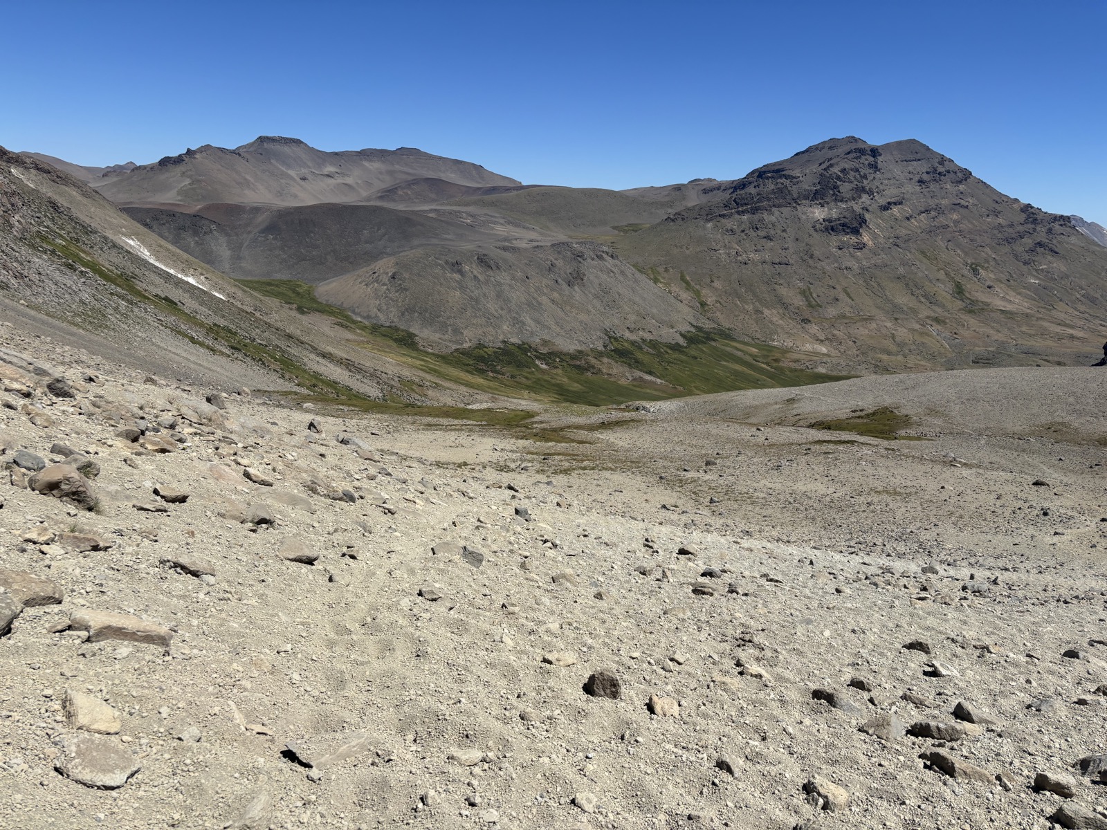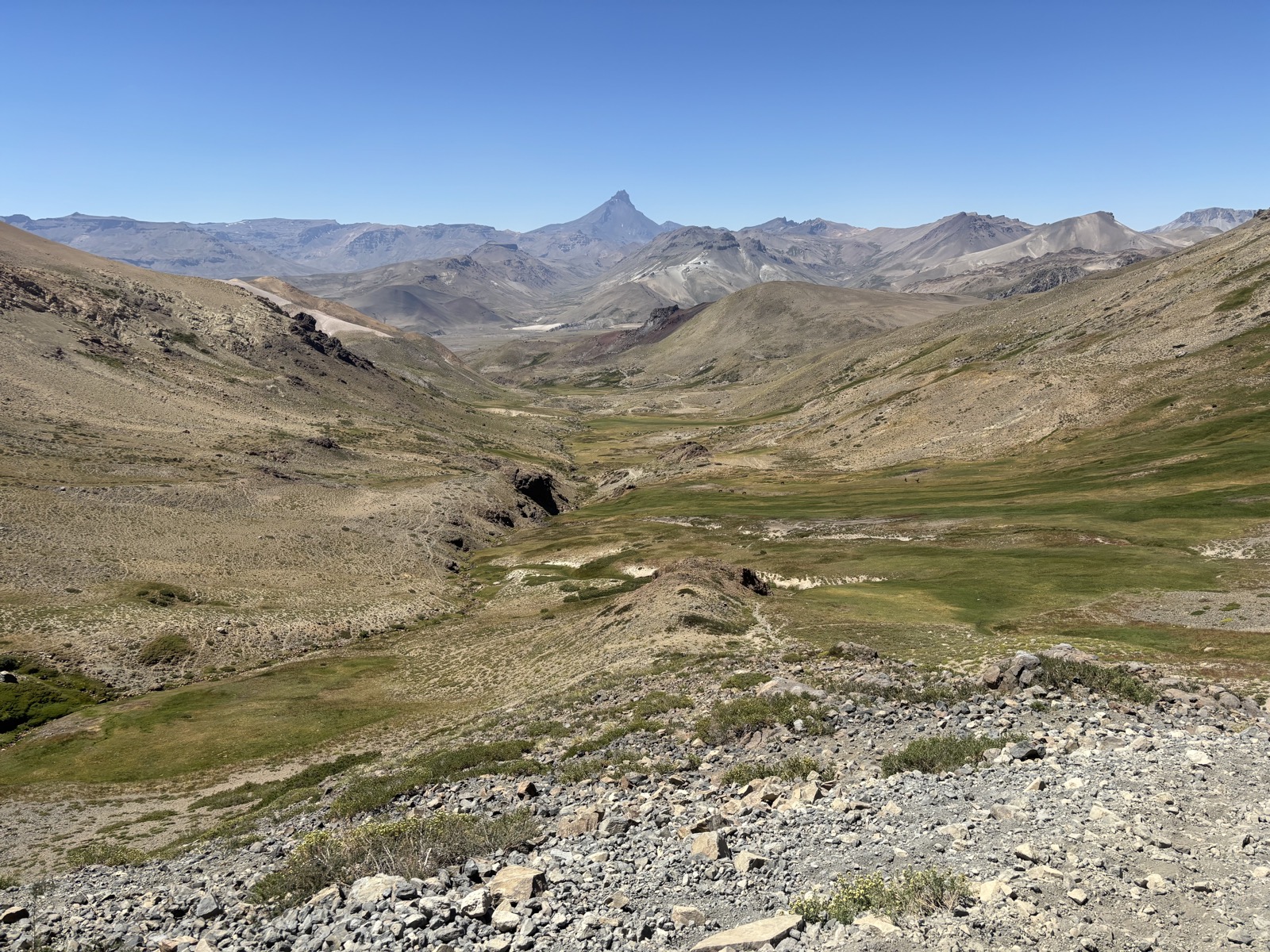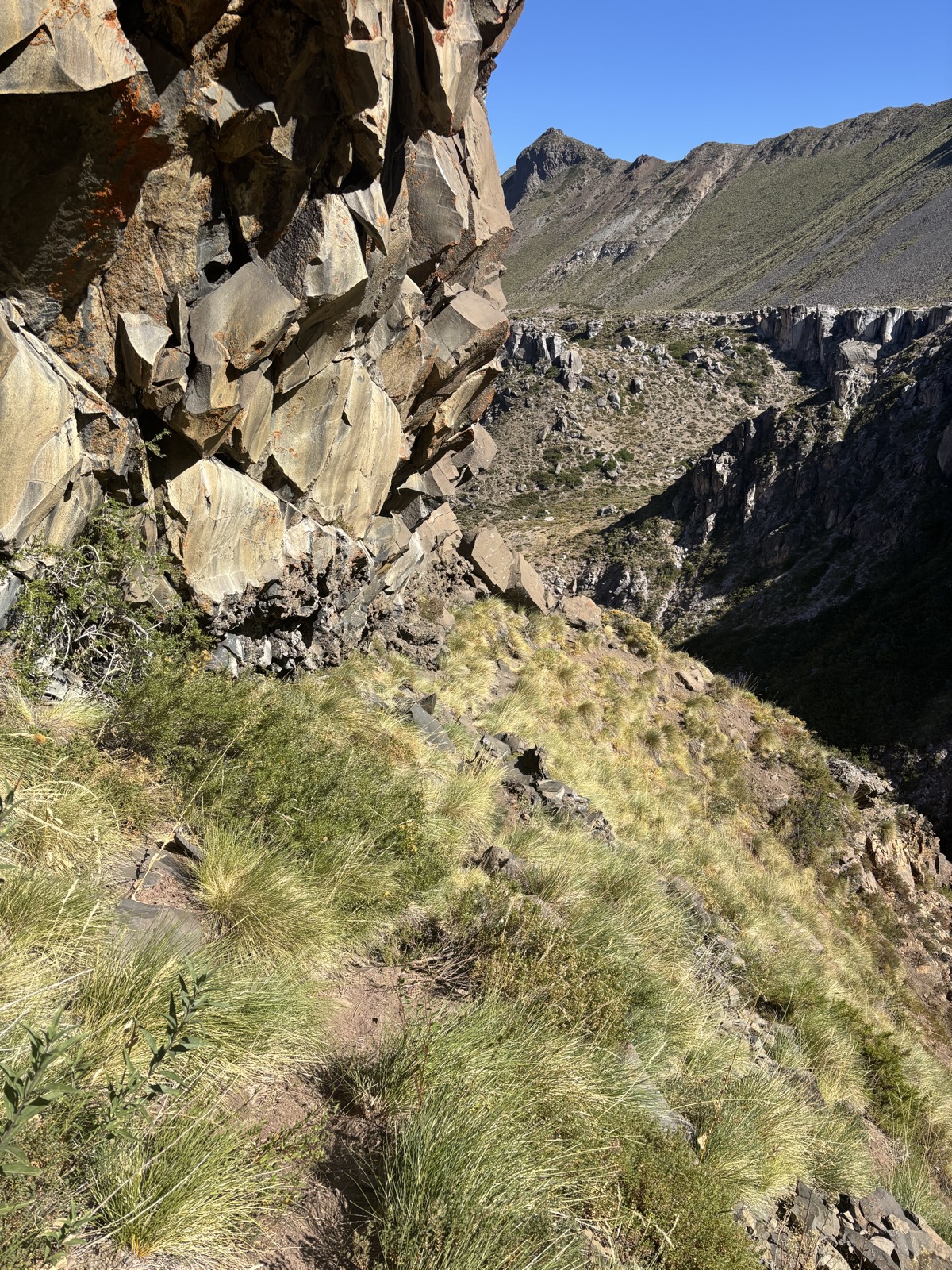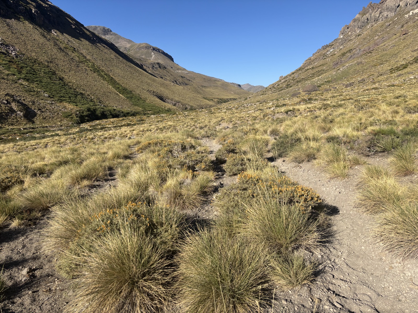 Další místo označené jako kemp je 17 km daleko. Snad tam dojdu. Prve ješte jdu širokým údolím, kde jsou občas trochu bažiny a taky jedno puesto a pak začnu klesat po kravské cestě, co vede ve svahu nad řekou. Tady už je údolí užší. Tento úsek má celkem tak 5 km.