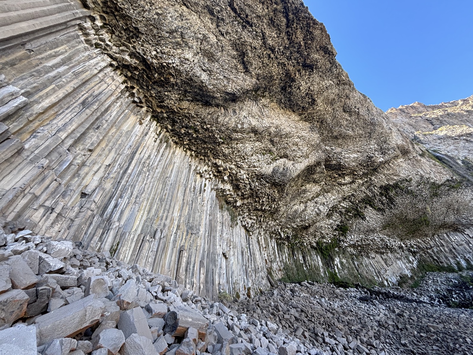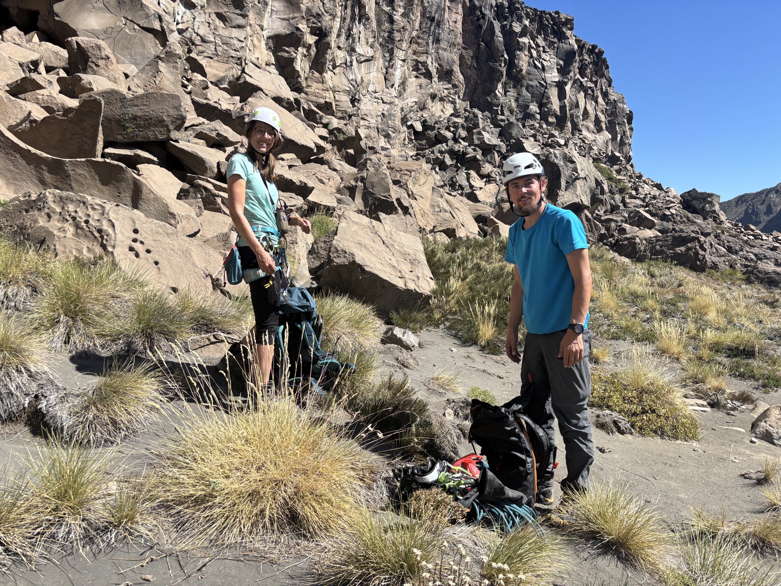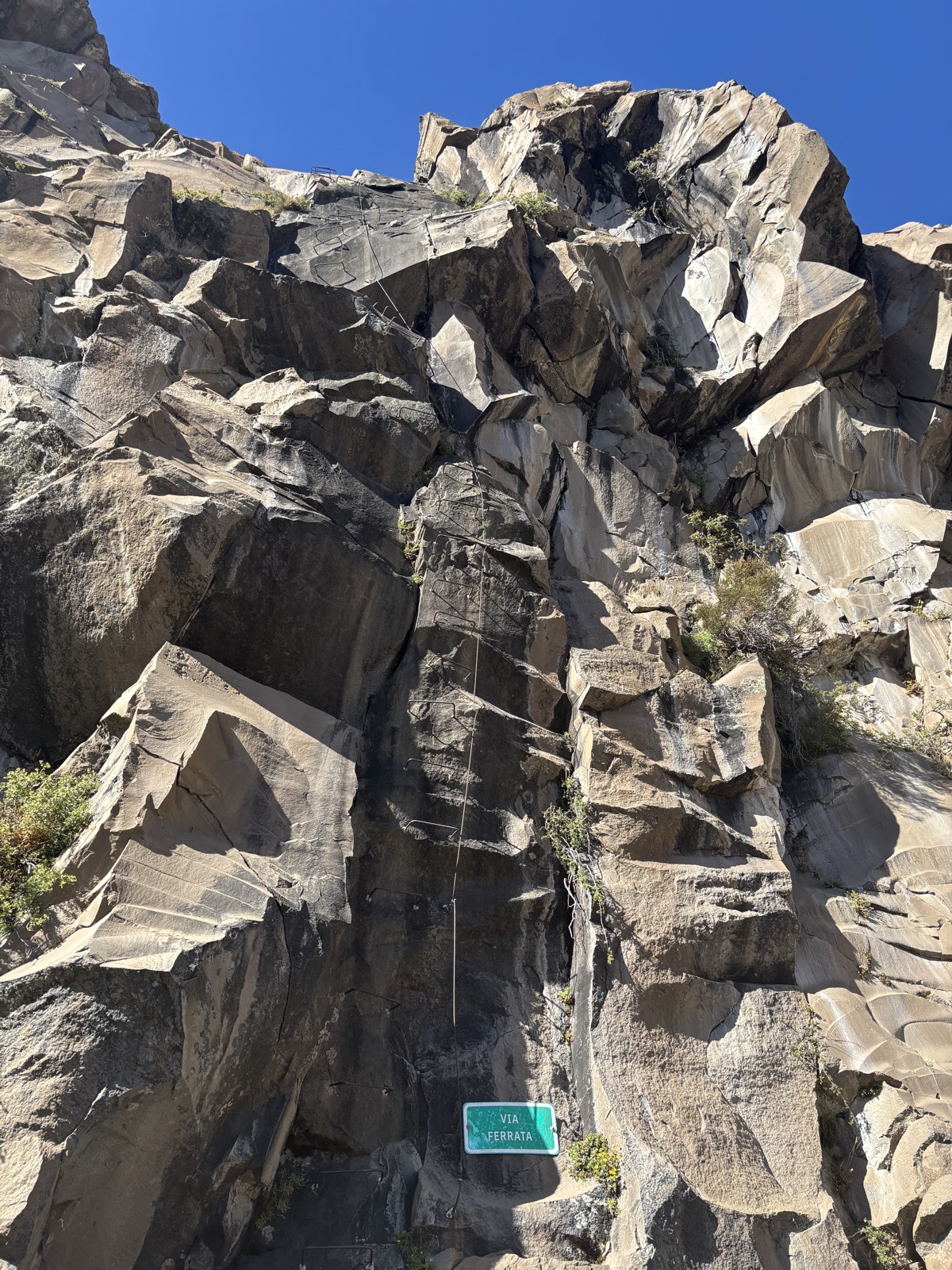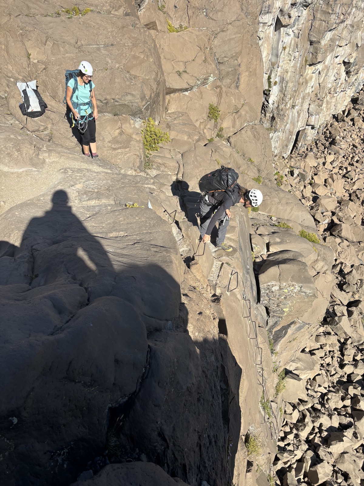 V 9:30 vyrážíme od auta pěšky. Akorát není úplně jasné kudy. Mají nějakého průvodce v PDF, ale jsou tam jen nějaké fotky a popis. Dojdeme na okraj útesu. Tudy se dolů nedostaneme. Má tu být nějaká via ferrata. A už vidíme, kde bude začínat. Dojdeme tam. Celé je to takový žebřík z kramlí. Jsou celkem tenké a některé nedrží úplně pevně. Ocelové lano je taky tenčí, než bývá v Alpách. Marcel jde první. Pak Lora. Oba mají helmy a aspoň smyčku s karabinou, kterou se jistí. Marcel mi zdola říká, že neví, jestli by mi to doporučil. Ze některý jsou uvolněný. Ale lano vypadá dobře. Tak říkám, ze to zkusím, jestli mi půjde se držet lana. Rozhoduju se nechat batoh nahoře. Schovám ho za šutr. Sestup celkem jde. Druhá půlka je převislá, tak to je samozrejmě trochu horší. Ale brzo to mám za sebou. Ani to nebylo tak zlé. Uvolněný byl snad jen jeden stup, tak jsem ho vynechal. Ale je samozřejmě dobře, že byl Marcel spíš opatrnej, koneckonců mě nezná.