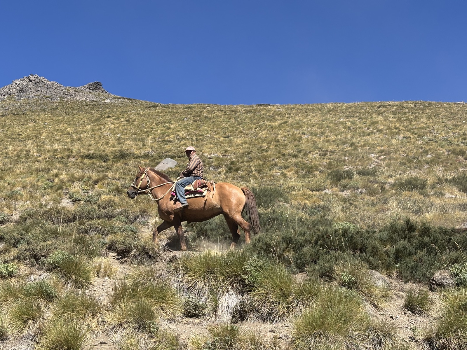 Půjdu asi kilák po asfaltce a pak odbočím na kamenitou cestu. Bude to tak 6 km a 600 výškových metrů do sedla. Jde to celkem hladce. Po cestě potkávám dost koní. Jsou hodně plaší, utíkají přede mnou už z velké dálky. Kéž by se to samé dalo říct o kravách!