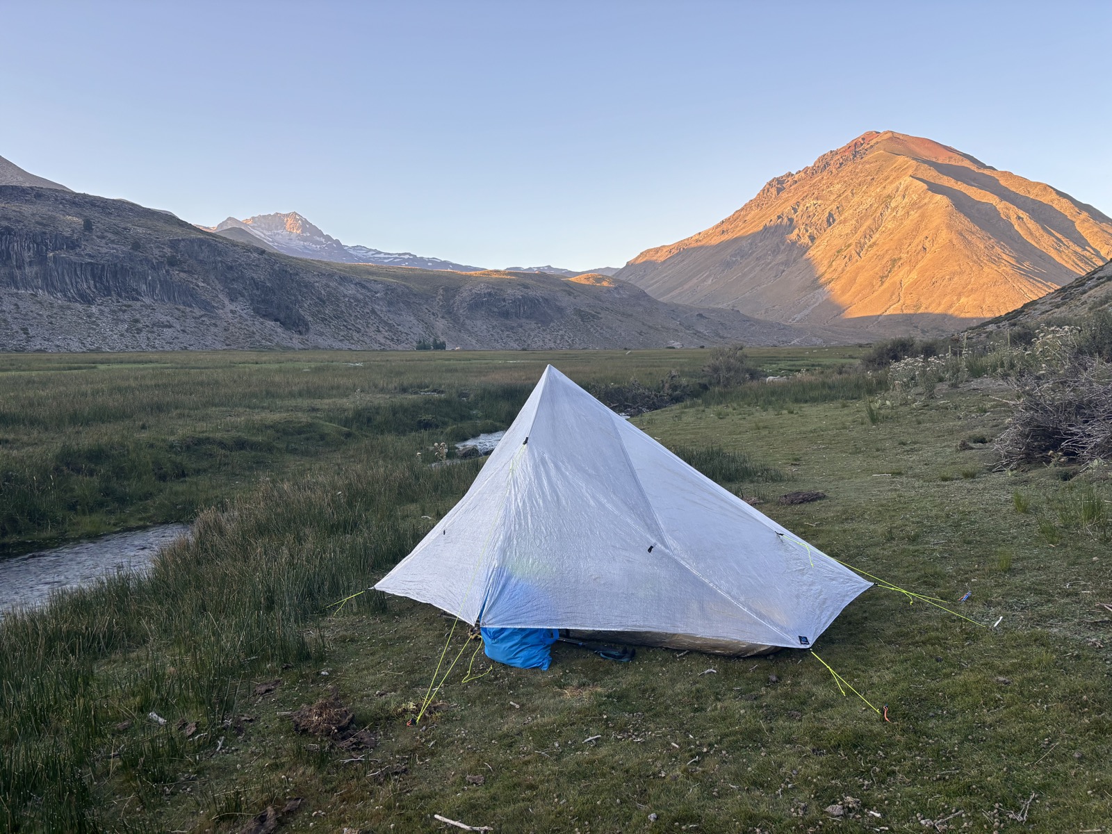 Asi 300 m před rozcestím a značeným kempem nacházím hezký travnatý plácek u potoka. Je velmi mírně šikmý a taky jsou na něm takové minihovínka – asi od ovcí? To zvládnu. Jsem tu v 19:55. Ještě mám minimálně hodinu světla.