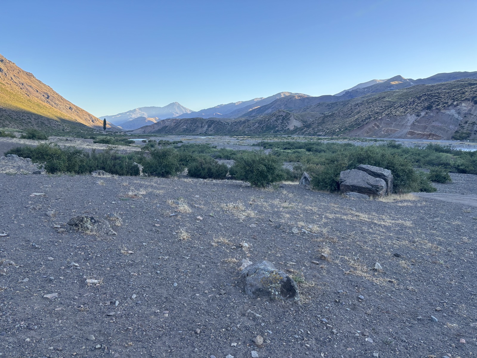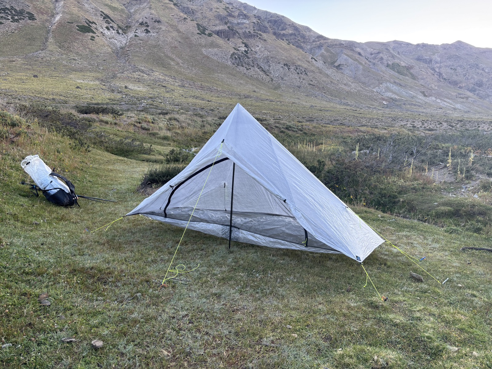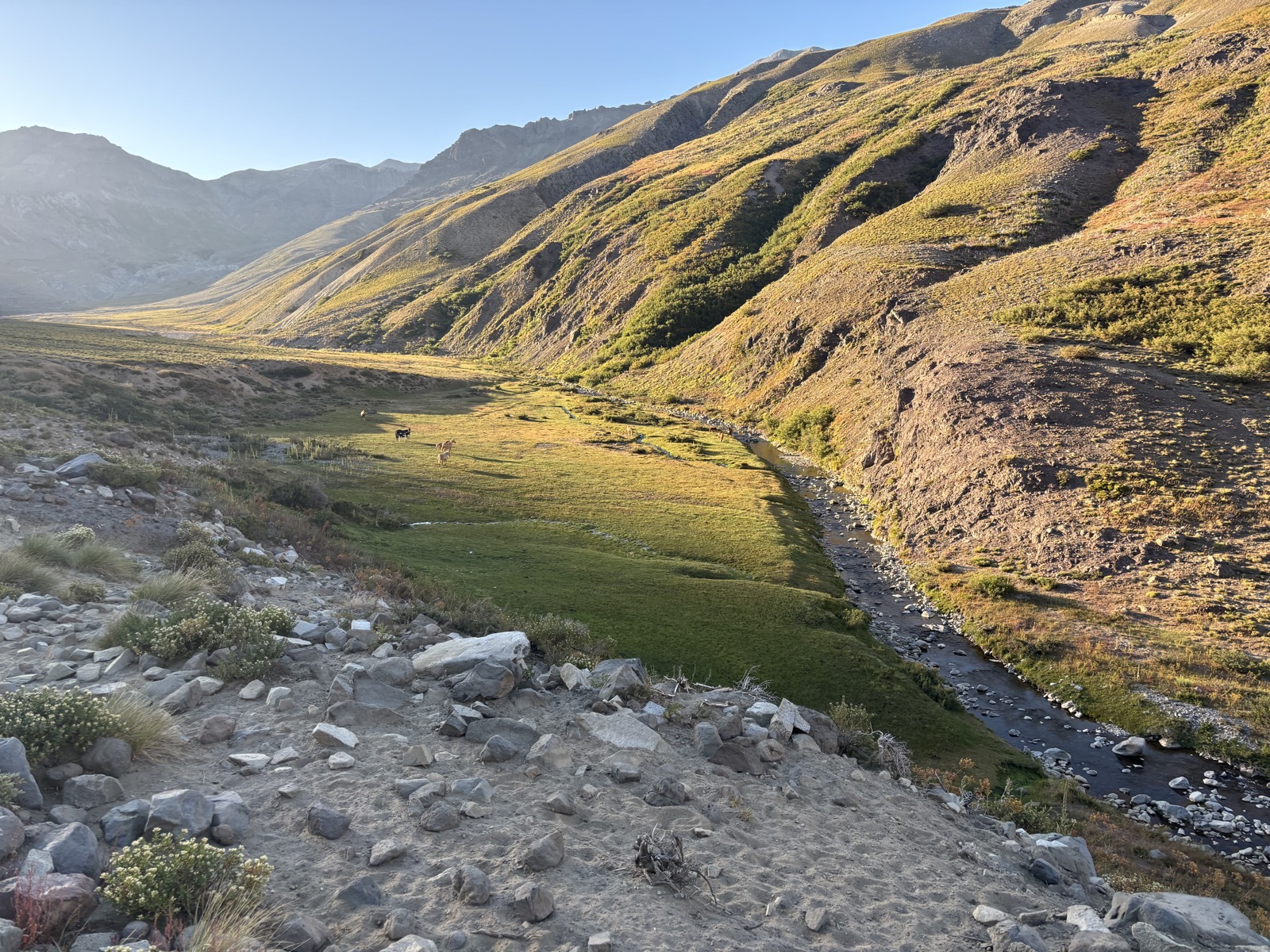 Sejdu dolů. Vyberu si místo. Koně skutečně prve utečou. Už se chystám stavět stan. Ale koně jsou zvědaví a blíží se ke mně. Hmm, co s váma. Raději jdu ještě tak o 200 metrů dál. Najdu plácek trochu za hrbem od koní a stavím stan. Udělám obvyklé úkony a pak se jdu podívat, co koně. No, jsou trochu blíž. Tak je jdu odehnat. Uvidíme, jestli to vydrží. Jako mě nevadí, když budou blízko. Ale nevím, jak daleko sahá jejich zvědavost. Jestli je nenapadne mi okusovat šňůry od stanu třeba. No, uvidíme.