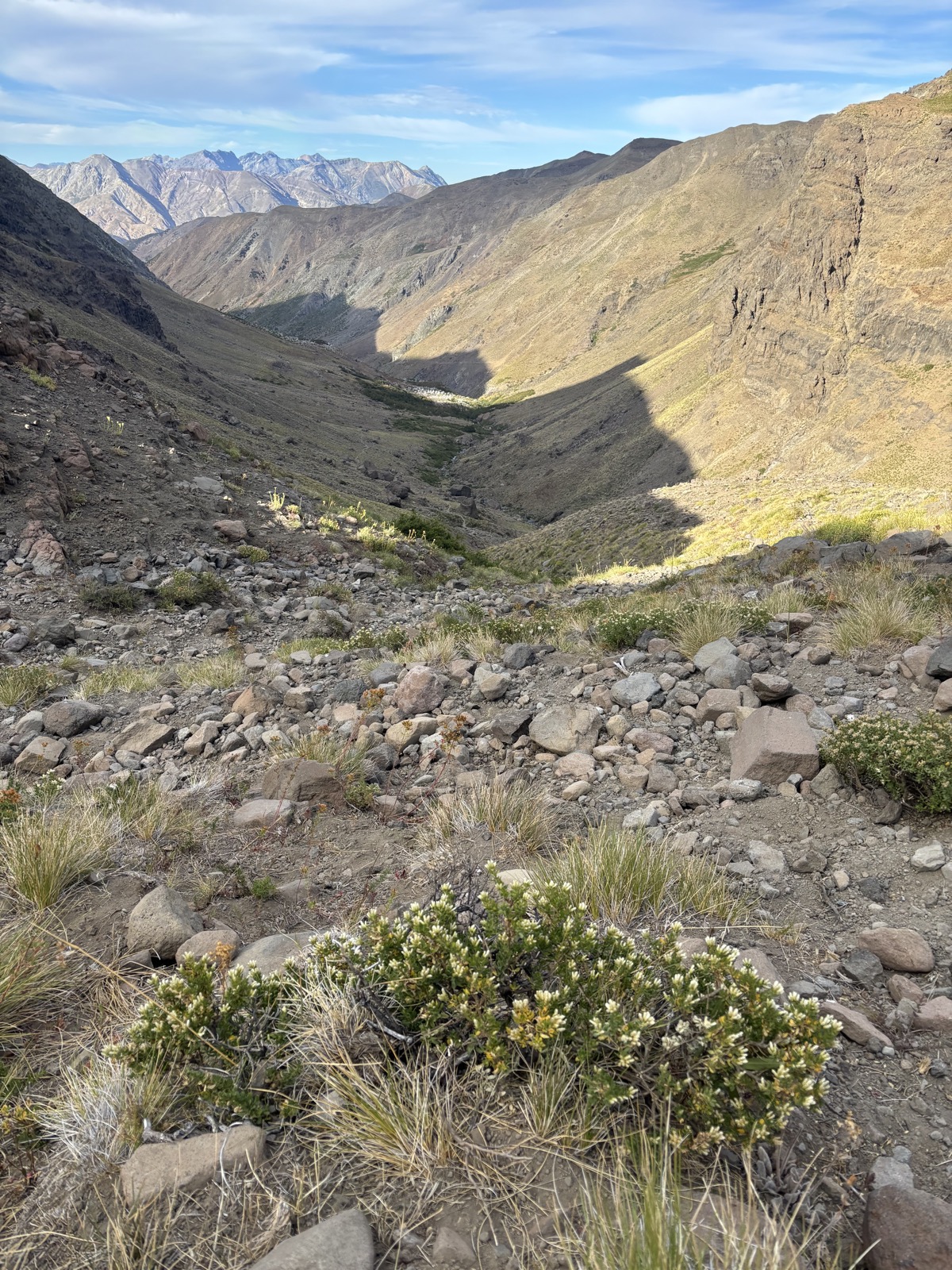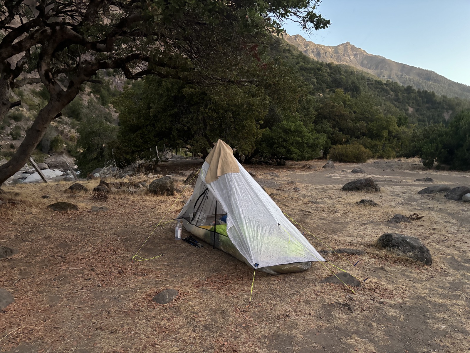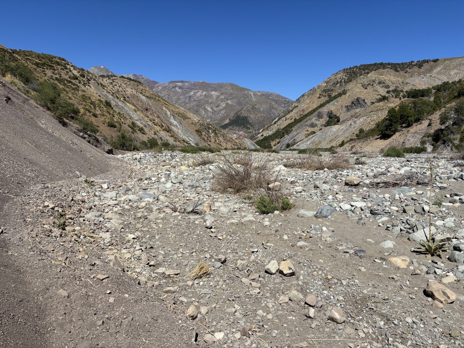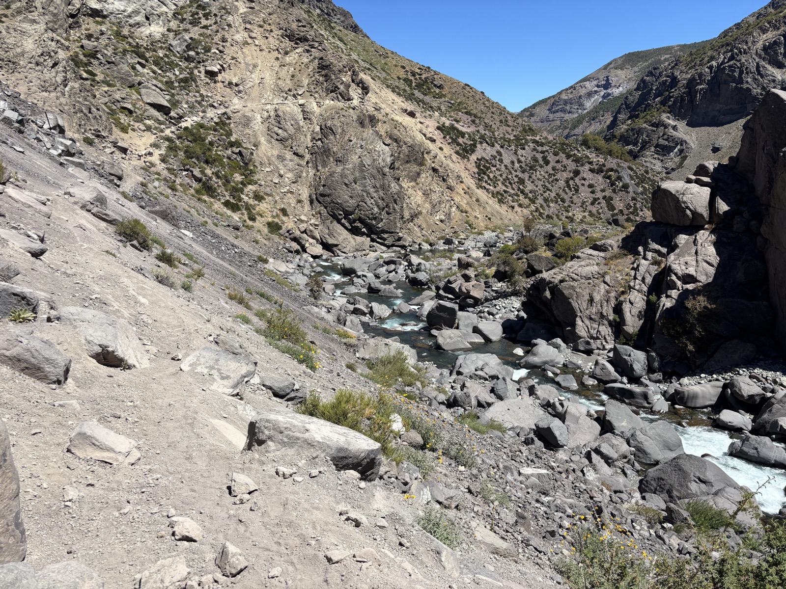 Někdy o půl sedmé dojdu na konec – El Inglés. Je tu kemp a přístup do řeky. Prve jsem myslel, že bych ještě dostopoval do nejbližšího městečka San Fabian, jenže tam bych nemusel snadno najít ubytko. Jsou tam nějaké cabaños, ale signál nemám, tak to nemám jak zkontrolovat. A navíc jsem špinavej a smradlavej, chtělo by to prve se okoupat a obléct do čistého. Jenže tím bych se zdržel. Možná nakonec bude nejlepší zůstat dnes tady v kempu a zítra ráno jet busem do San Fabian a pak dál až do Santiaga.