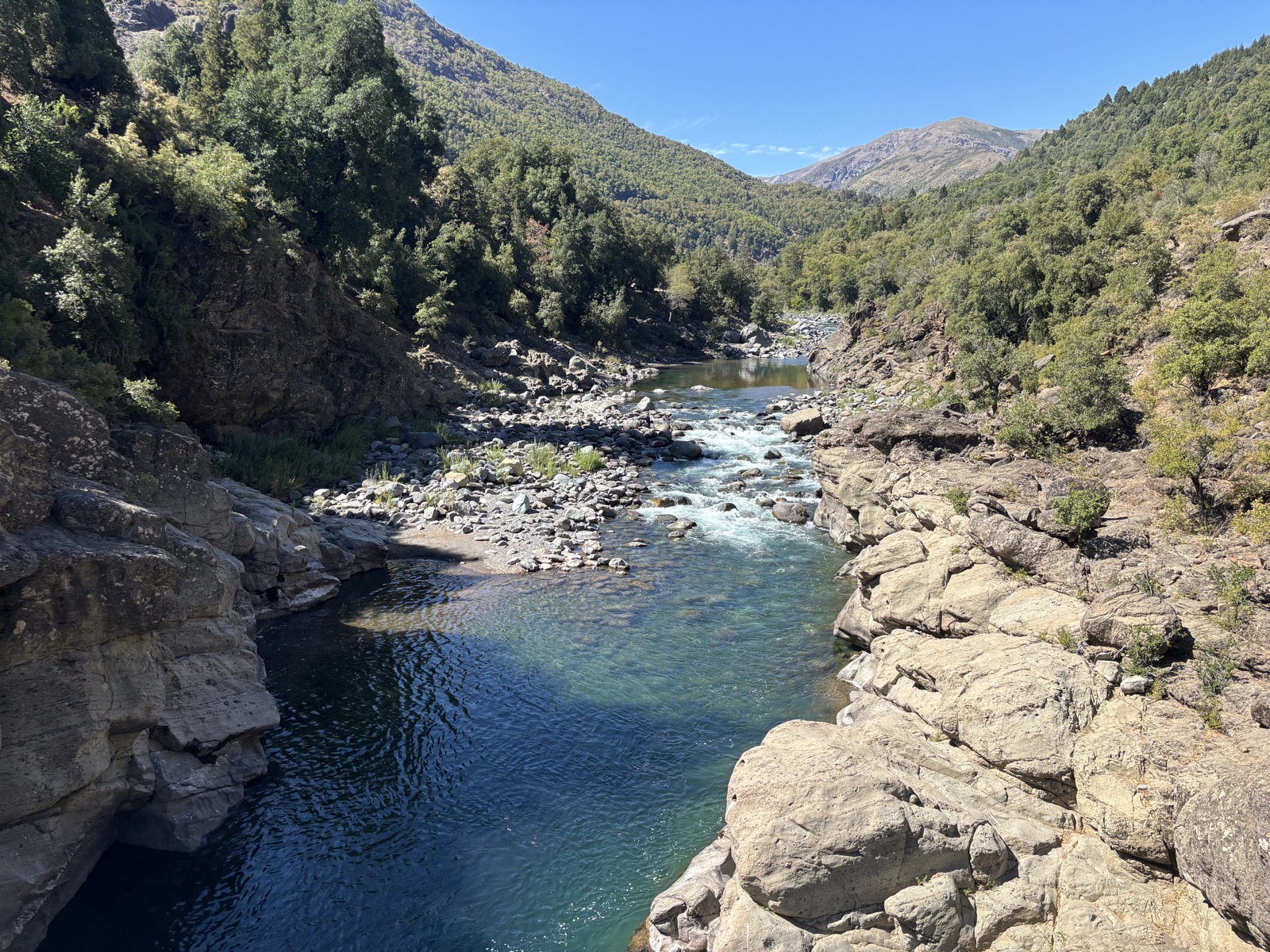 Teď co mě čeká na druhé straně. Mám to dnes 30 km, než začne závěrečných 10 km po štěrku. Tak to by tak za 10 či 15 km uz mohl být snazší terén průjezdný pro auto? Nemohl. Terén je velmi členitý a to až skoro do úplného konce. Ale je pravda, že aspoň kvalita stezky se tak po 15 km o hodně zlepší. Jdu postupně několika úzkými údolími. Dole řeka, tu v jednom kilometru brodím hned asi 4x sem a tam.