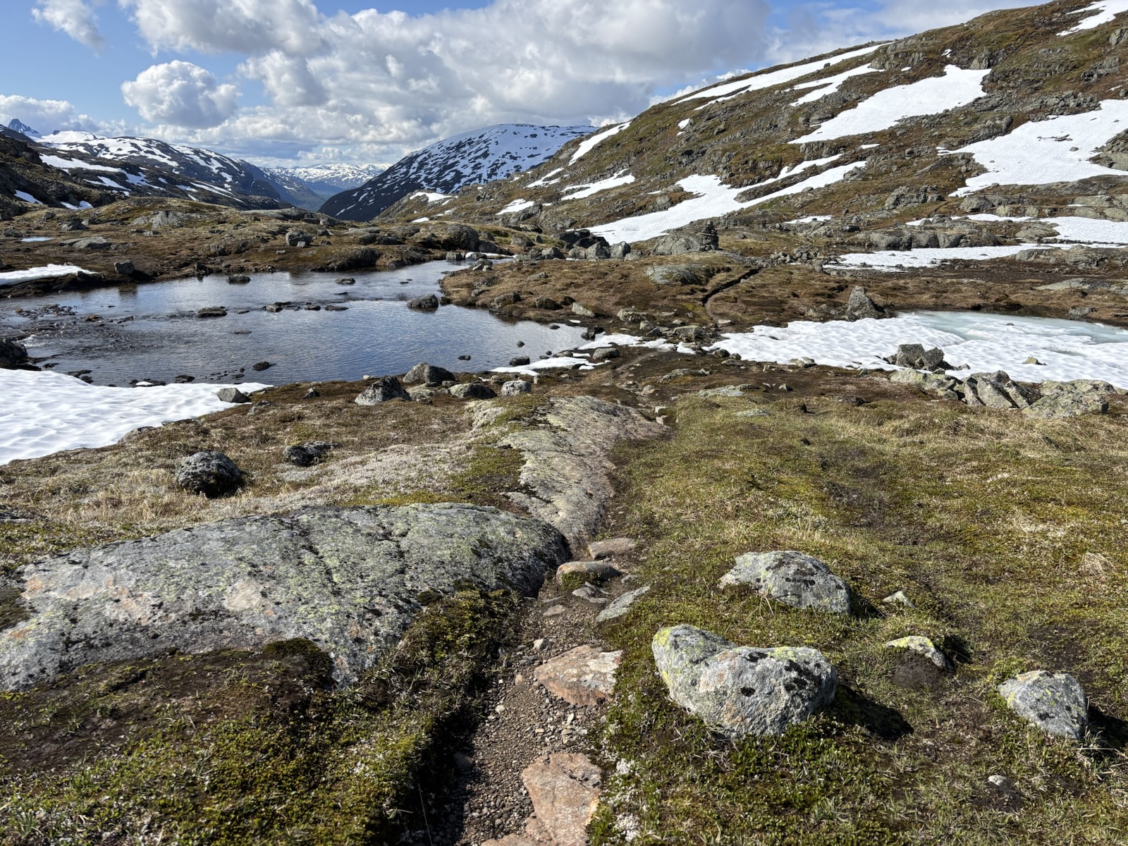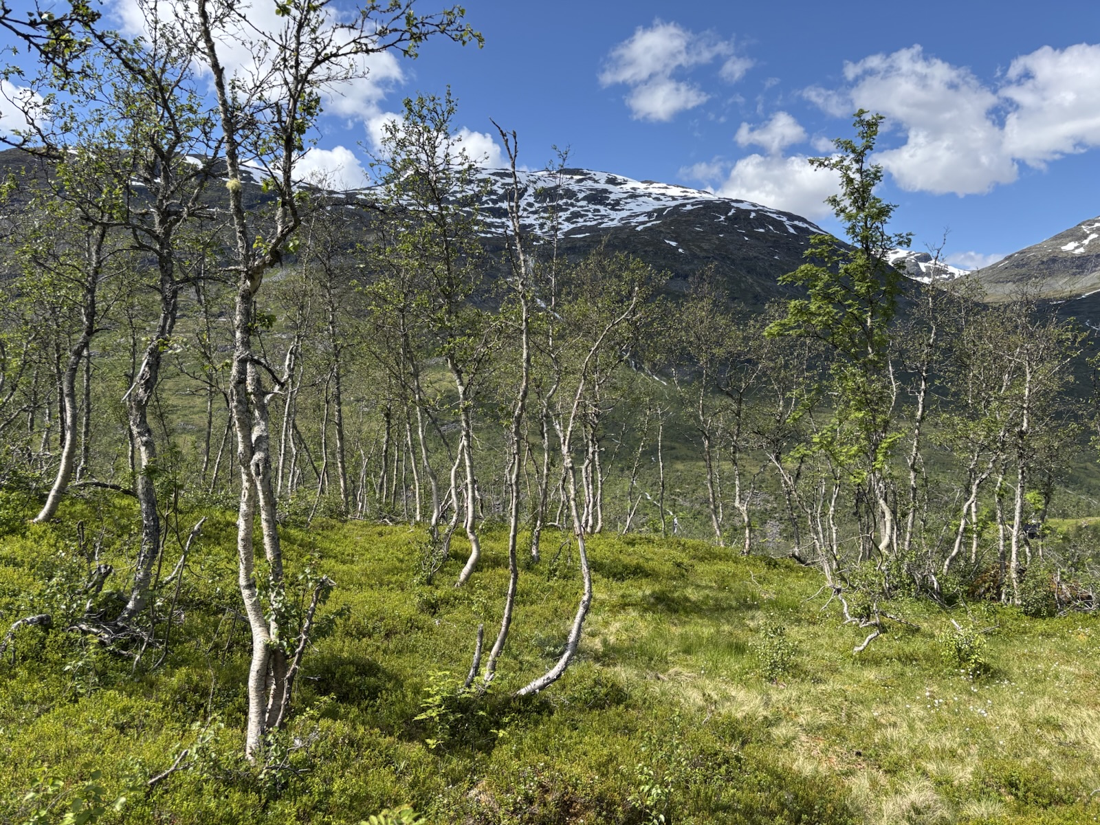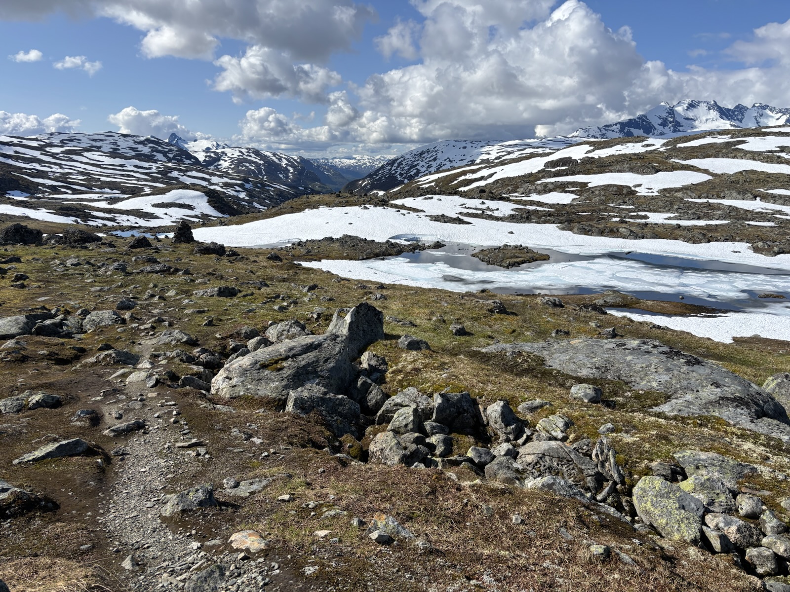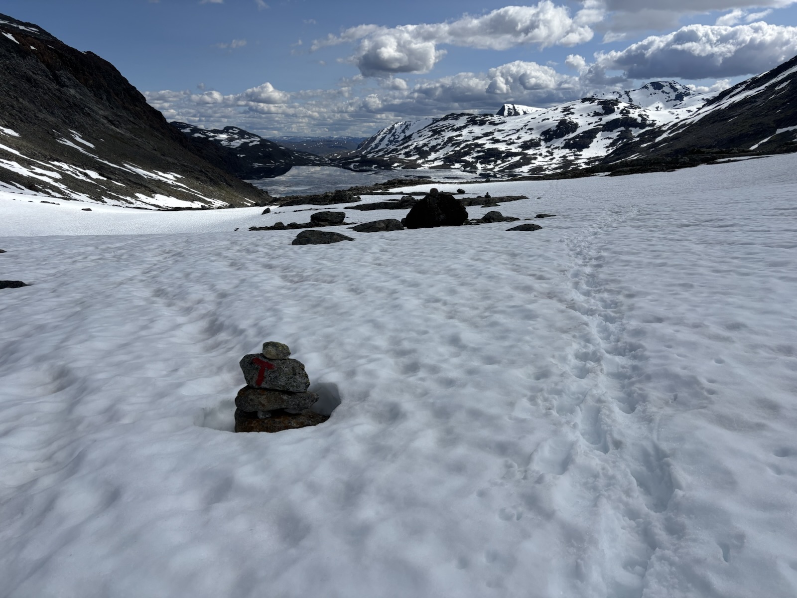 Vyrážím v 9. Kdybych se držel striktně Massiv Trailu, tak jsem měl včera spát na chatě o pár km výš po silnici a dnes bych měl jít s organizovanou skupinou přes ledovec na chatu, co je ve výšce 2000 m a je to nejvýše položená chata v Norsku. Jenže skupina vyráží až kolem poledne a určitě se budou hrozně courat, fakt mě to neláká. Nějaký borec psal na blogu, že to šel sám, ale to se mi asi taky moc nelíbí. Přechod ledovce má víc jak 1 km a jak je všude hodně sněhu, tak nebudou vidět trhliny. Nejspíš by bylo ok následovat stopy ostatních, ale i tak je to risk. A navíc si říkám, že sněhu už jsem si užil až až. Takže tuto atrakci vynechám a půjdu údolím a tím si to trochu zkrátím. Svoje souputníky z prvního dne už tím pádem určitě neuvidím.