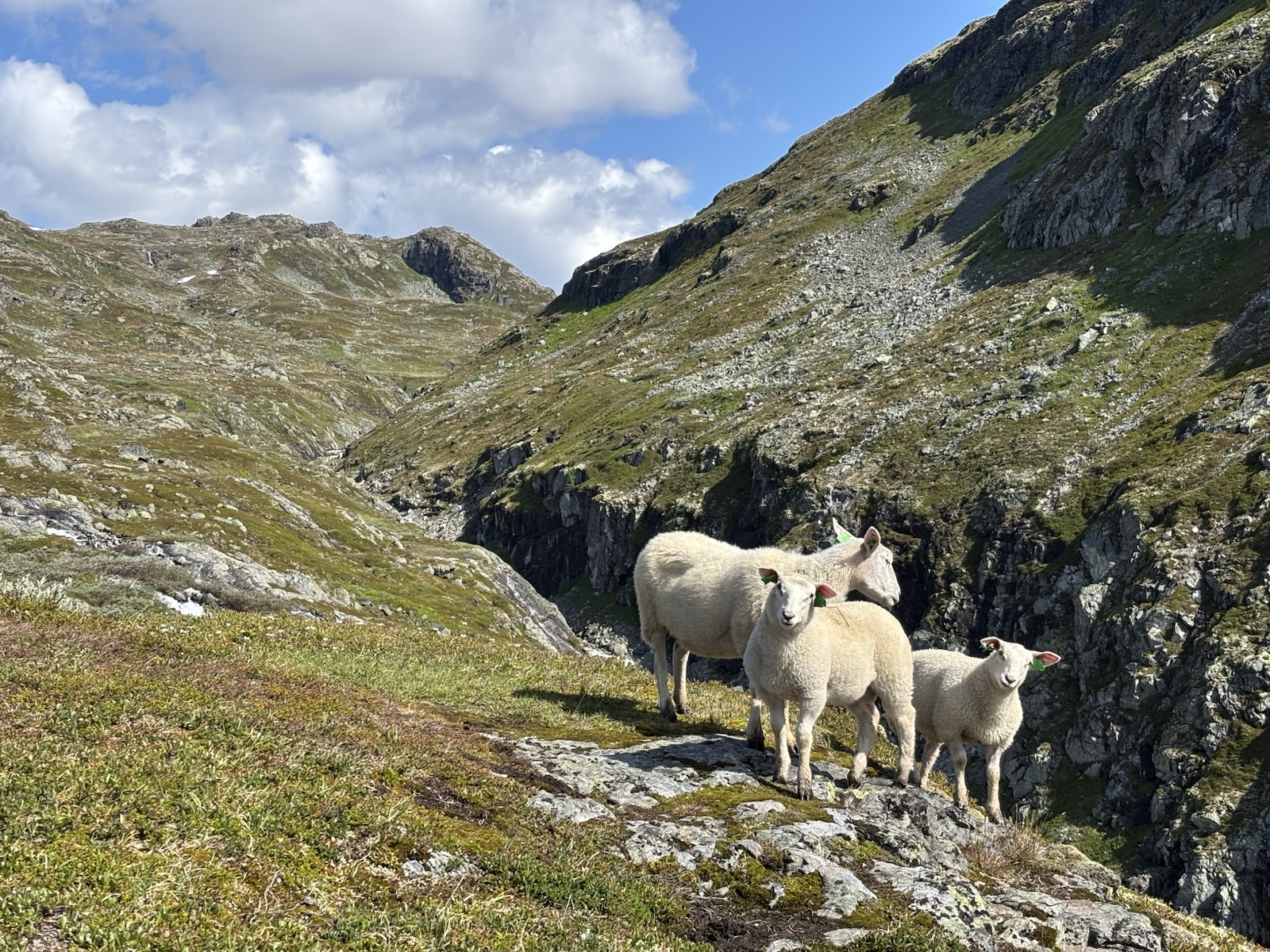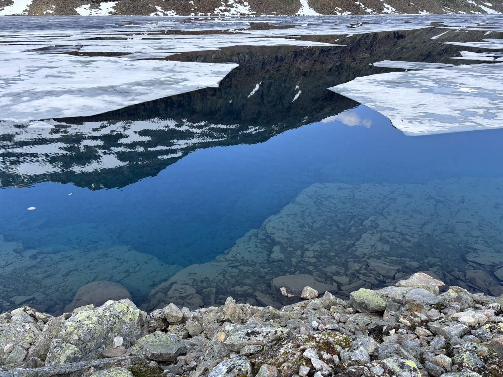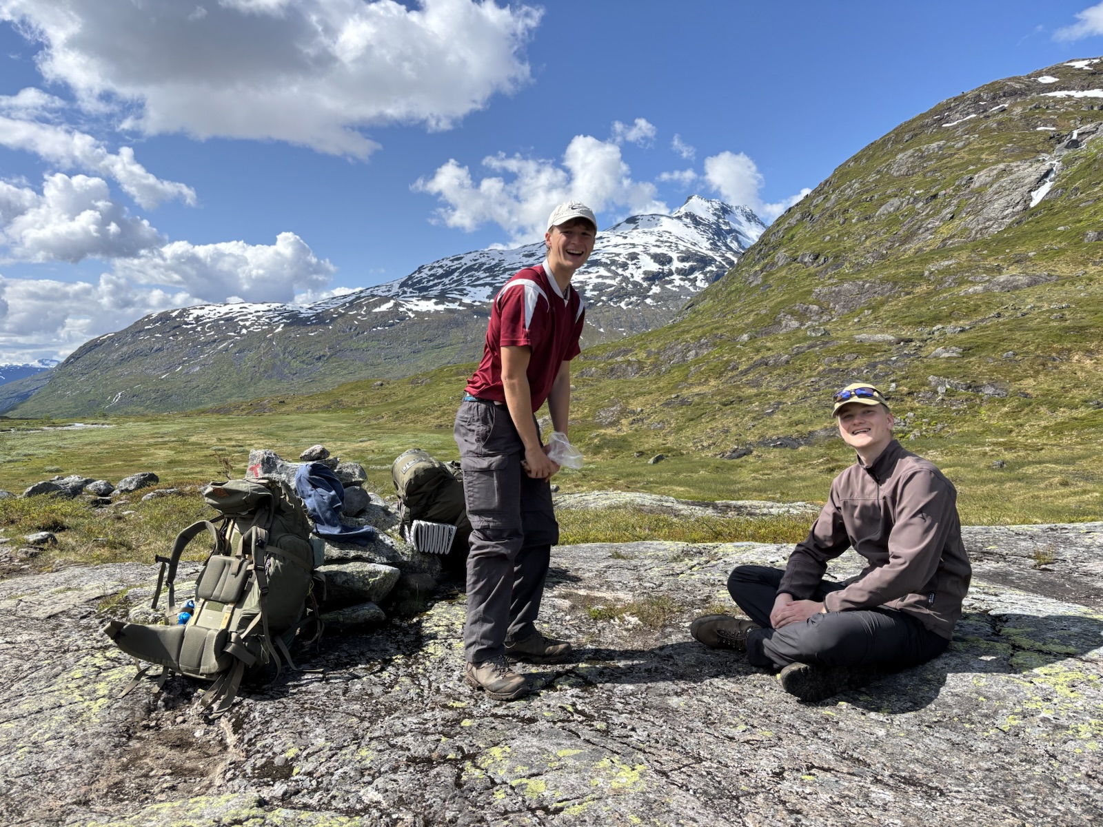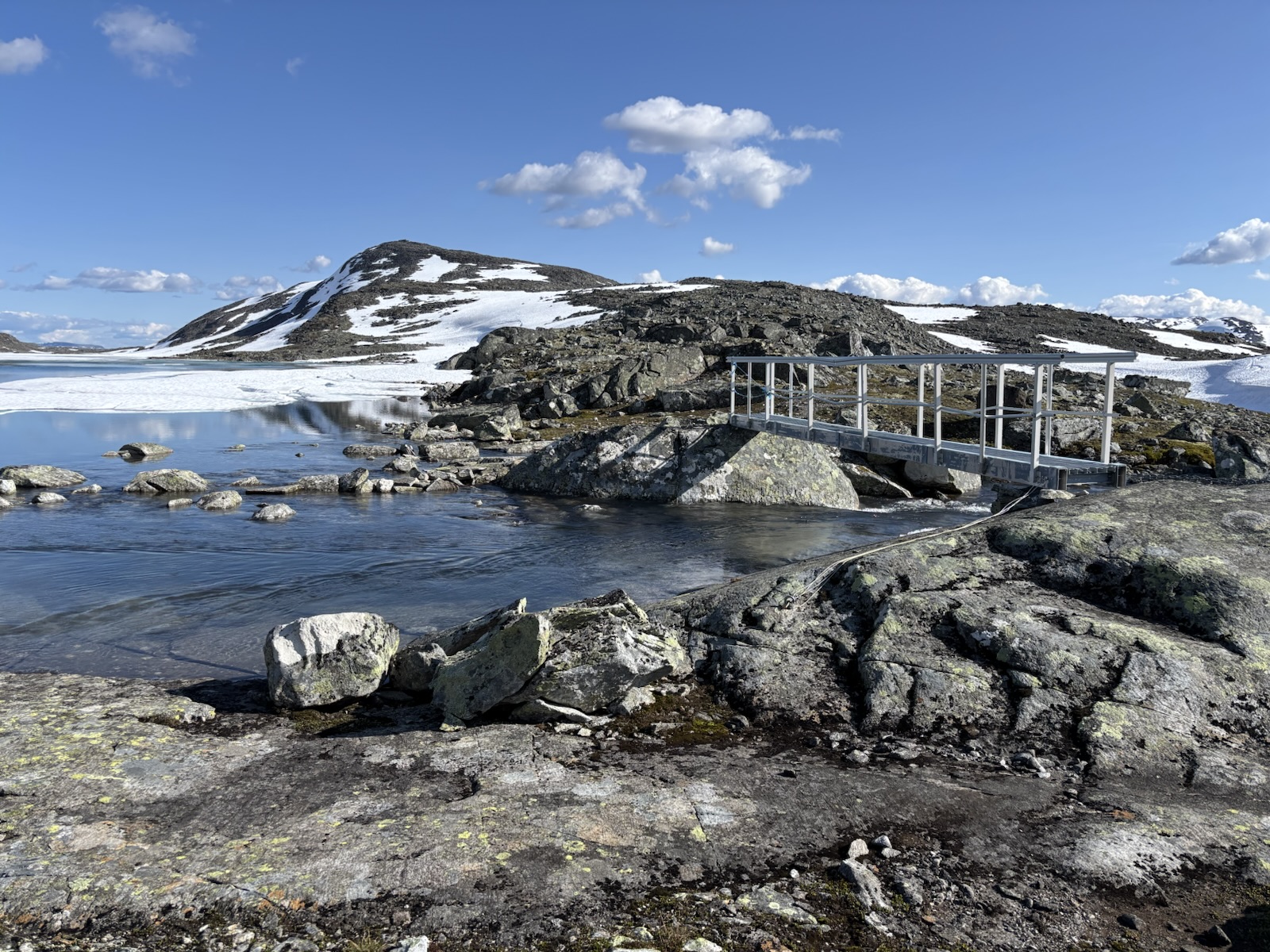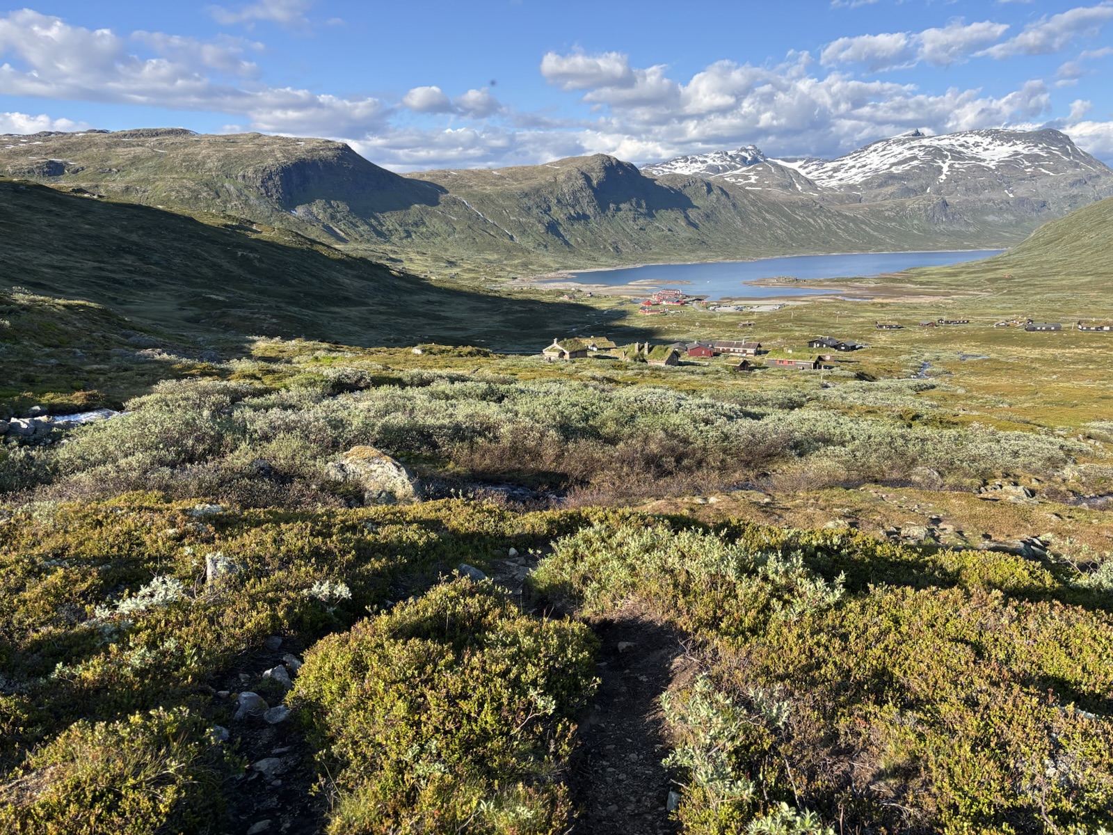 Vyrážím v 9. Kdybych se držel striktně Massiv Trailu, tak jsem měl včera spát na chatě o pár km výš po silnici a dnes bych měl jít s organizovanou skupinou přes ledovec na chatu, co je ve výšce 2000 m a je to nejvýše položená chata v Norsku. Jenže skupina vyráží až kolem poledne a určitě se budou hrozně courat, fakt mě to neláká. Nějaký borec psal na blogu, že to šel sám, ale to se mi asi taky moc nelíbí. Přechod ledovce má víc jak 1 km a jak je všude hodně sněhu, tak nebudou vidět trhliny. Nejspíš by bylo ok následovat stopy ostatních, ale i tak je to risk. A navíc si říkám, že sněhu už jsem si užil až až. Takže tuto atrakci vynechám a půjdu údolím a tím si to trochu zkrátím. Svoje souputníky z prvního dne už tím pádem určitě neuvidím.