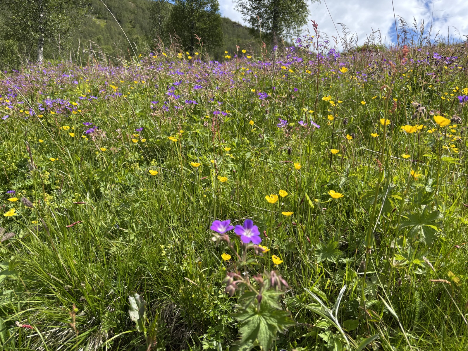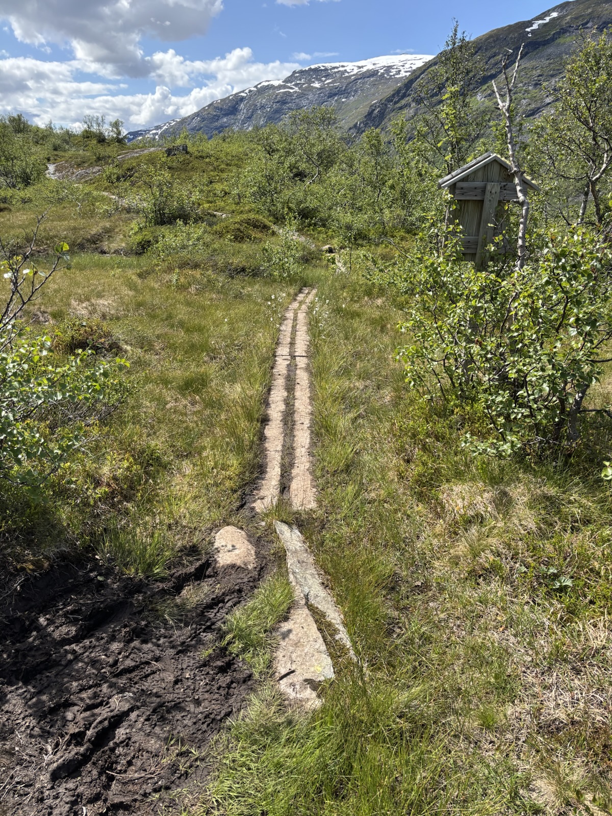 Když dojdu do nejnižšího místa, ocitnu se u rozcestí – tady se spojuju s cestou od té chaty ve 2000 m. A je tu most přes řeku. Přejdu ho a pak následuje taková podmáčená cestička v celkem husté vegetaci. Mírně se to vlní. Za pár km dojdu k první chatě – Skogadalsbøen. Je velmi sympatická a nevede sem žádná silnice. Tady by to bylo fajn zůstat, akorát škoda, že je teprv 12:48.