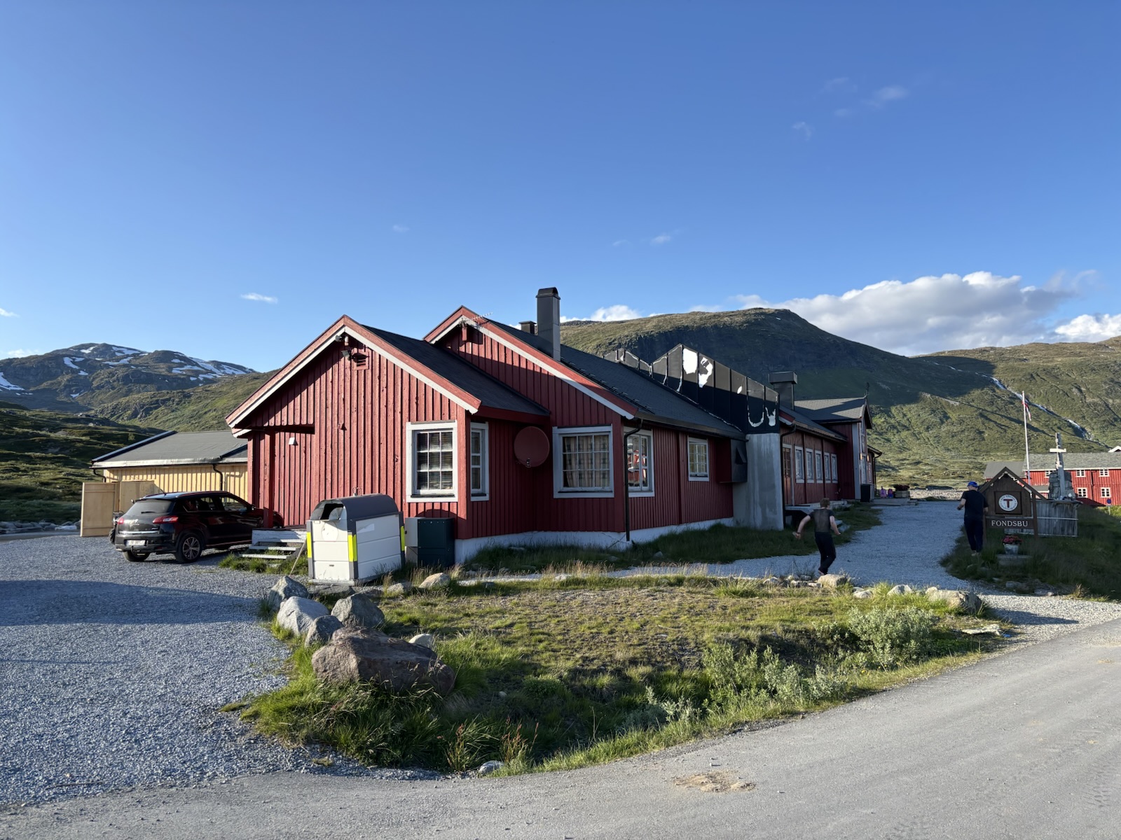 Je tu velký hotel a před ním moje chata Fondsbu. Tady přespím. Je to chata DNT, takže mě neodmítnou. Je to tu blázinec. Spousta lidí. Chvilku čekám na obsluhu. A pak se ubytuju. Prý budu spát na matraci v nějaké místnosti. Už jsou tam 2 další lidi. Je to v domku vedle a v přízemí je sušárna a záchody a sprchy. Super, takže tentokrát nemusím už pak nikam chodit a všechno je pohromadě! A snídaně je dokonce od 7, bomba! Ptám se na večeři. Mohl bych ji mít v 9. Tak dlouho se mi nechce čekat. Ptám se, jestli by nešlo něco hned. Prý mi borec může udělat sendvič. Ok! Za pár minut mám sendvič v ruce a za další minutu je ve mně!