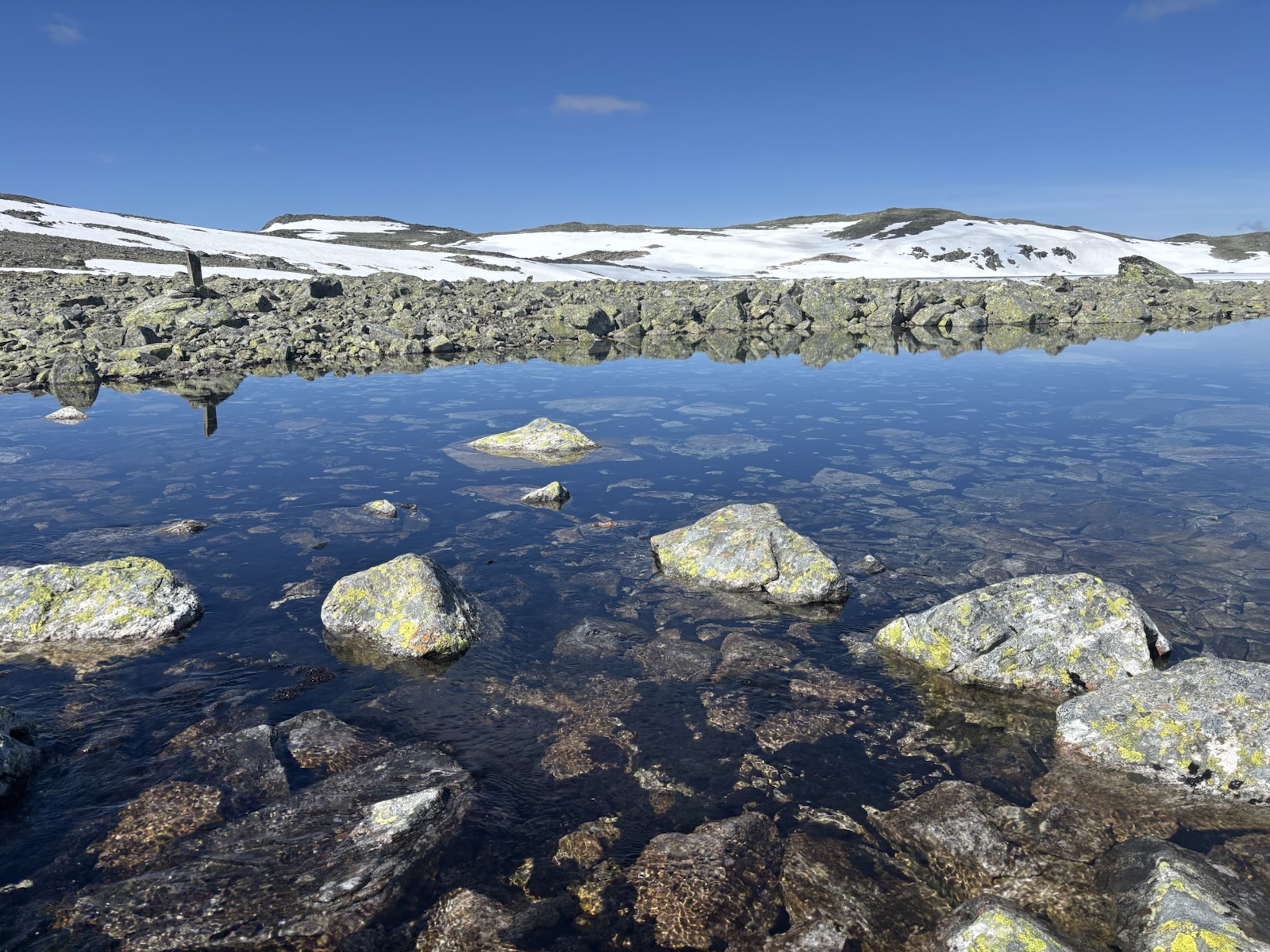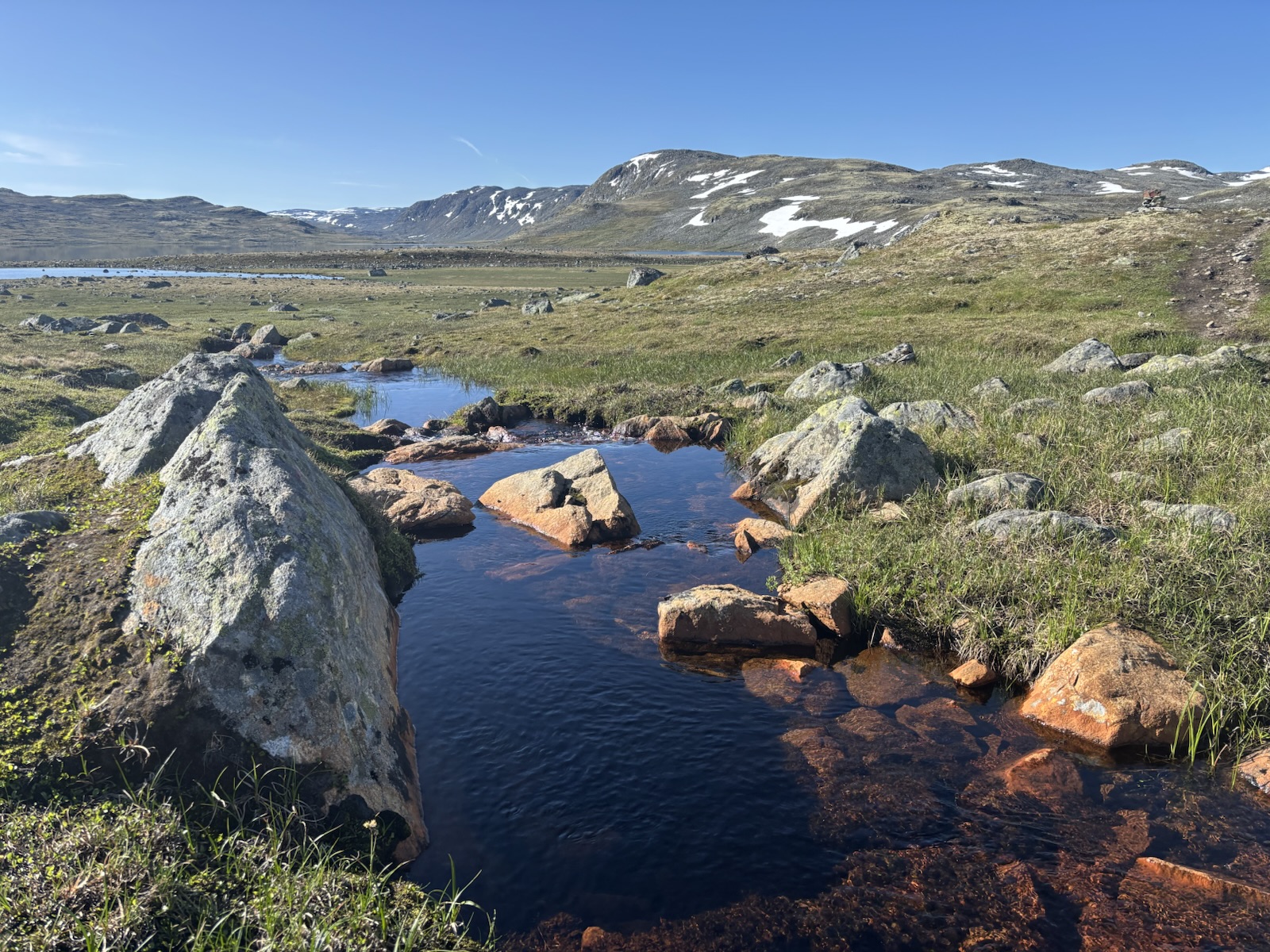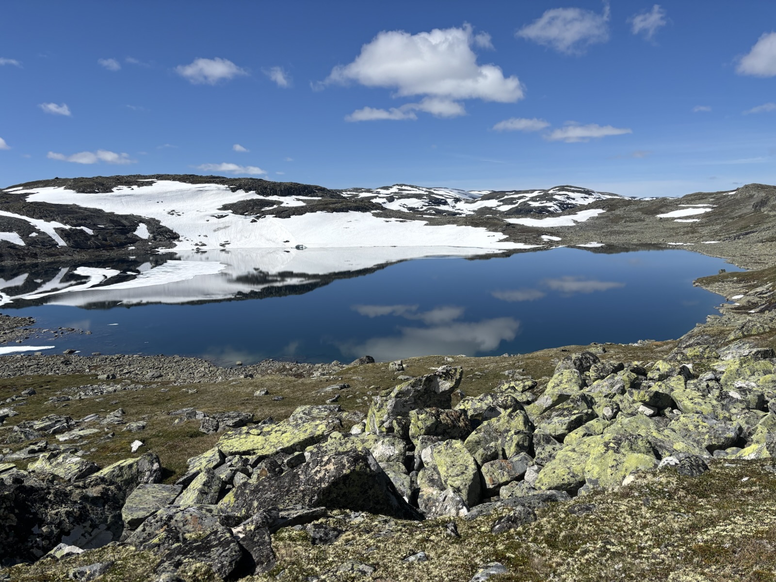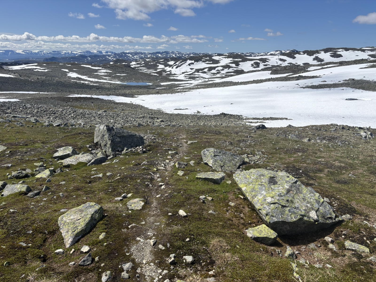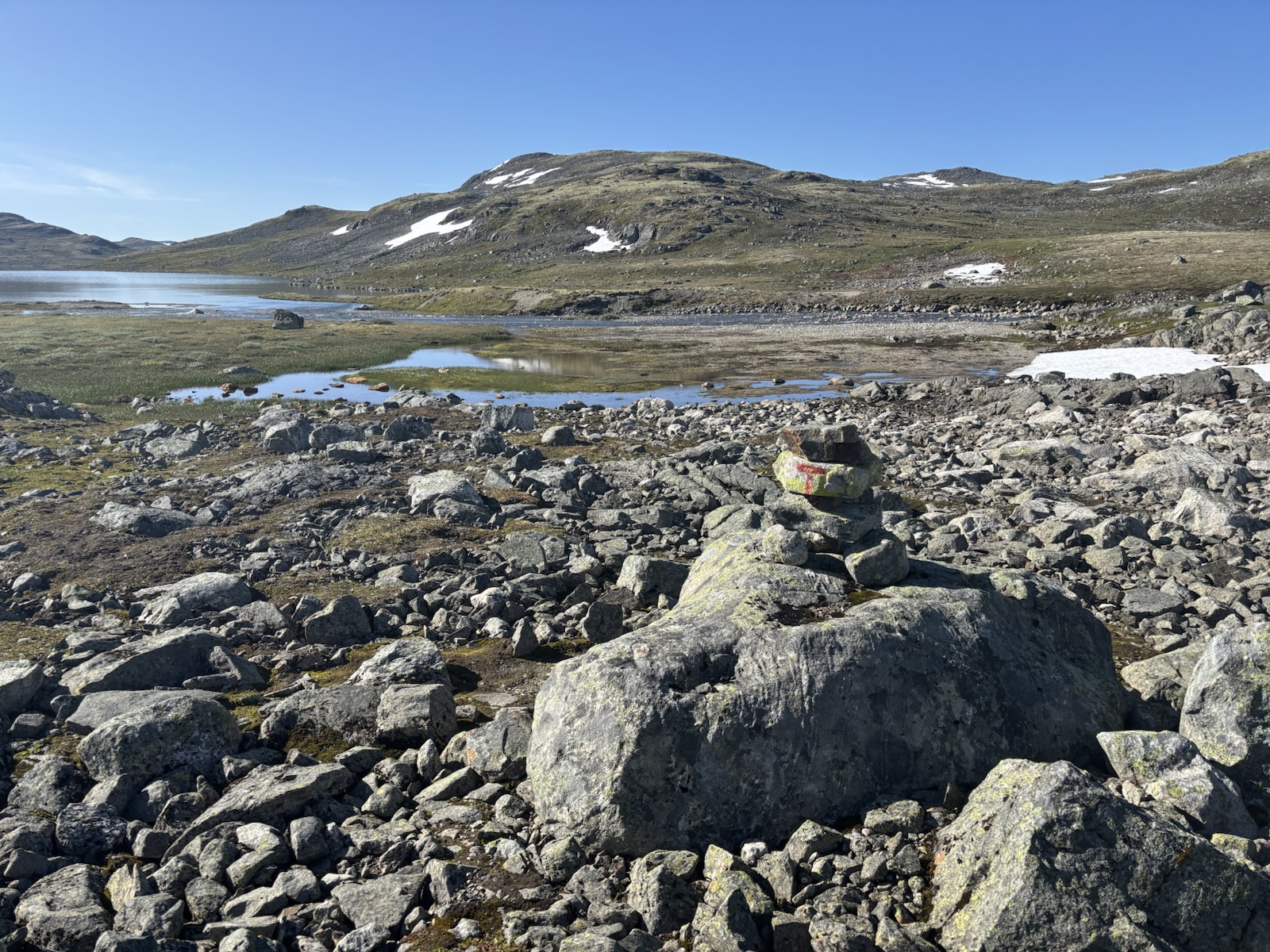 Po 14 km dojdu k chatě Bjordalsbu. Chata bude asi ok, ale to místo je taková pustina plná šutrů. Je 10:53. Ani se nezastavuju a pokračuju dál. Pauzu jsem totiž měl okolo desáté.
