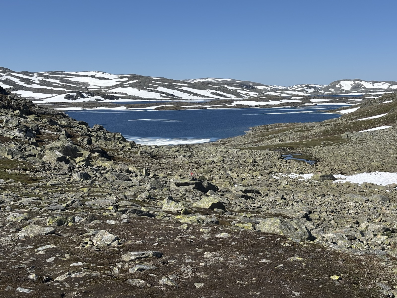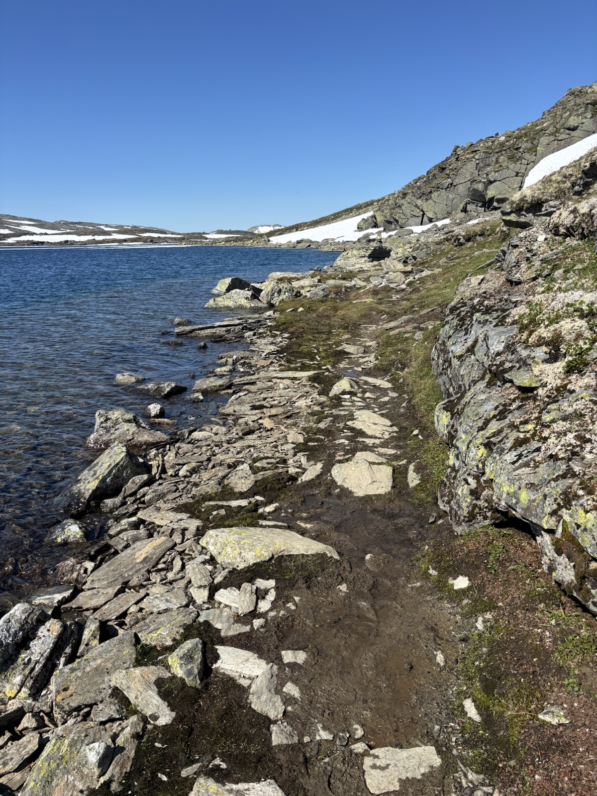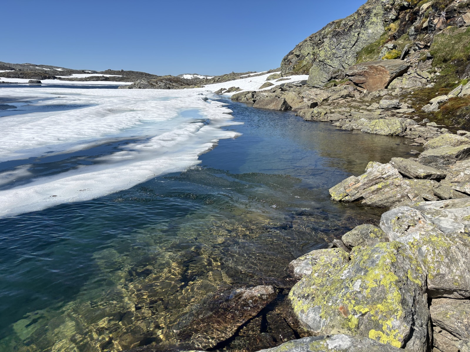 Postupně docházím celkem dost lidí. A taky potkávám lidi jdoucí opačným směrem. Jak se dostanu výš, tak jsou tu zase hezká napůl zamrzlá jezírka. Jen kdyby ta stezka byla lepší. Ale aspoň, že se dnes cítím plný sil, jde mi to dobře.