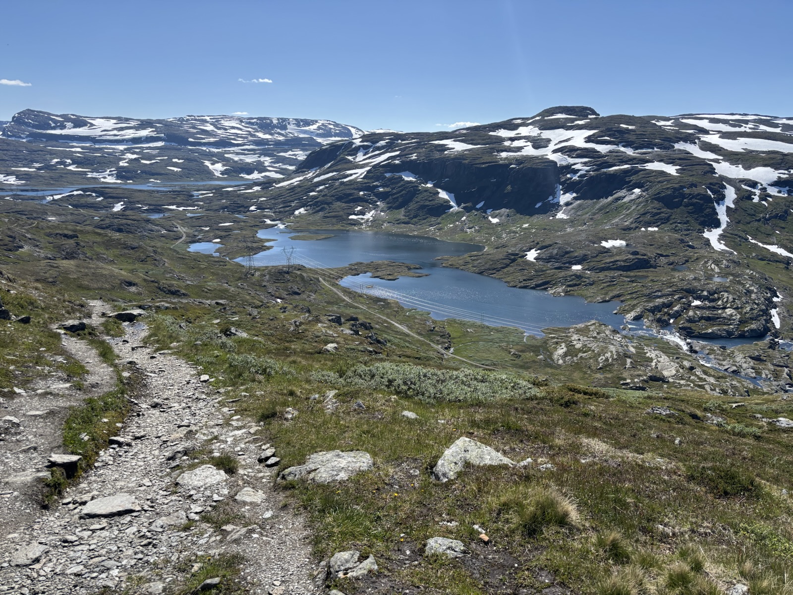 Pak se pode mnou objeví jezero a u něj silnice, která vjíždí do tunelu a nad tím tunelem vede stezka. Je tu krásná členitá krajina. Zbývá už jen sestoupit dolů a v 15:40 jsem u chaty.