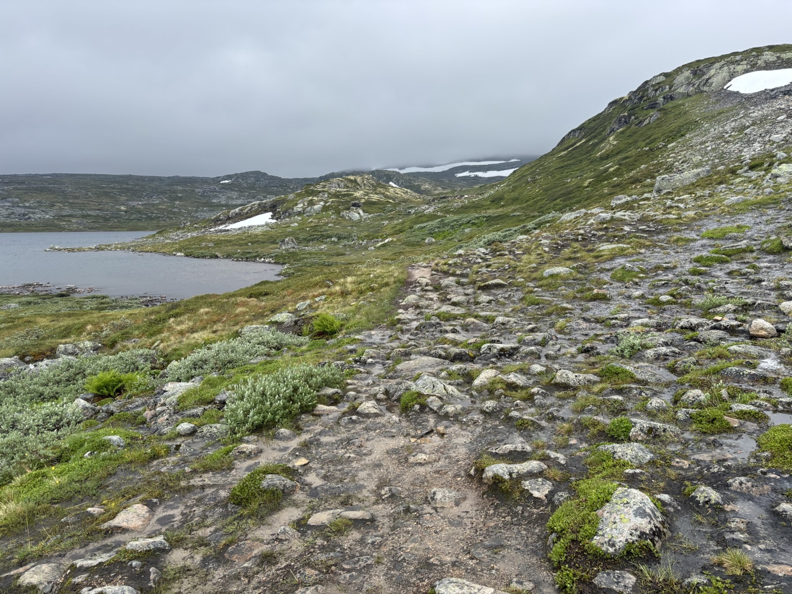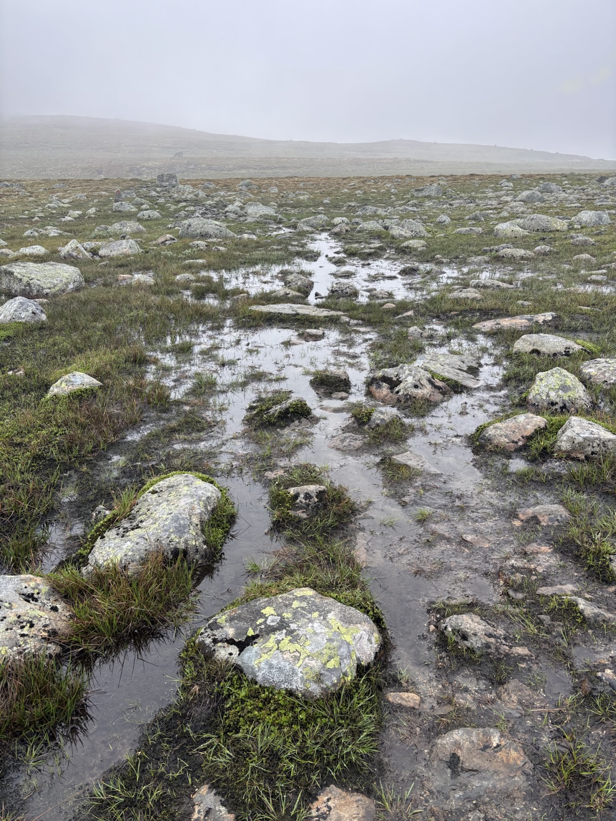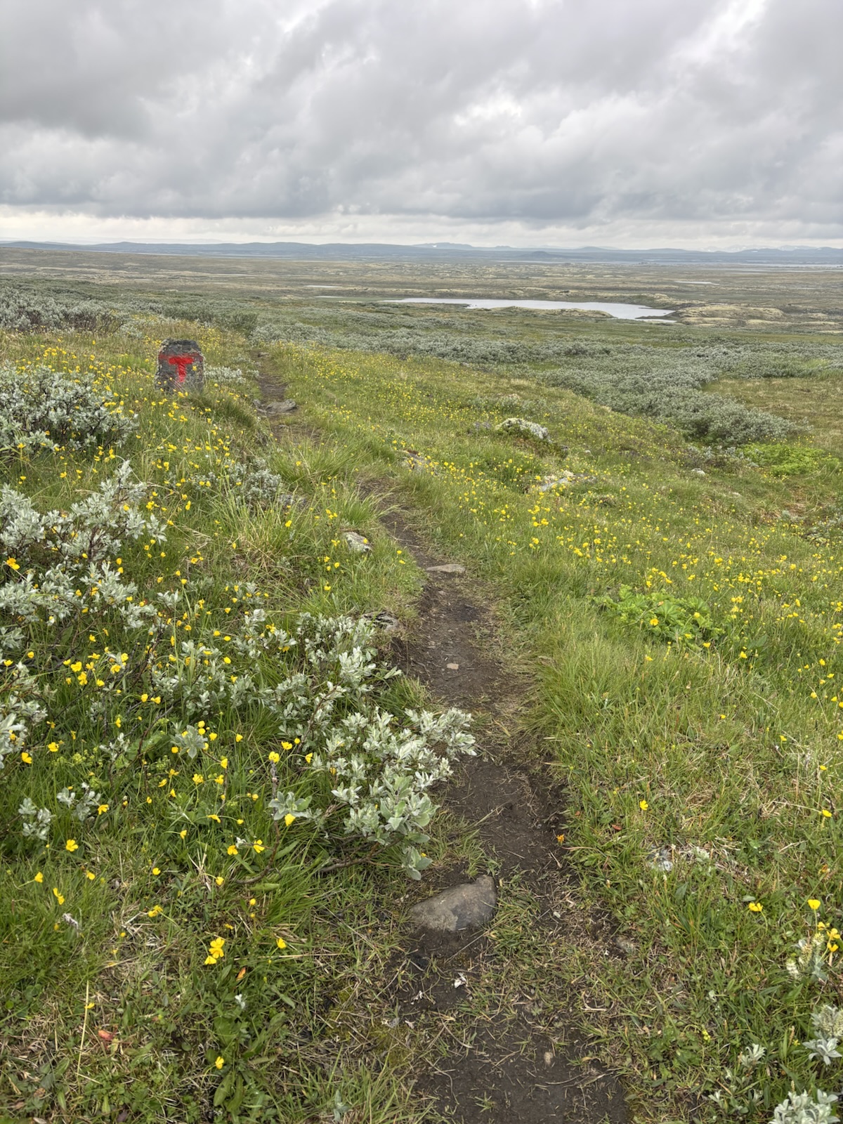 Hned ze začátku je stezka super, takový černý štěrk a rovina. Krajina už není kamenitá, spíš je všechno travnaté. A postupně se objevují různé bažinaté úseky. Takže suché nohy moc dlouho nevydrží. Tempo se taky mírně zpomaluje, ale pořád jdu blízko k 5 km/h.
