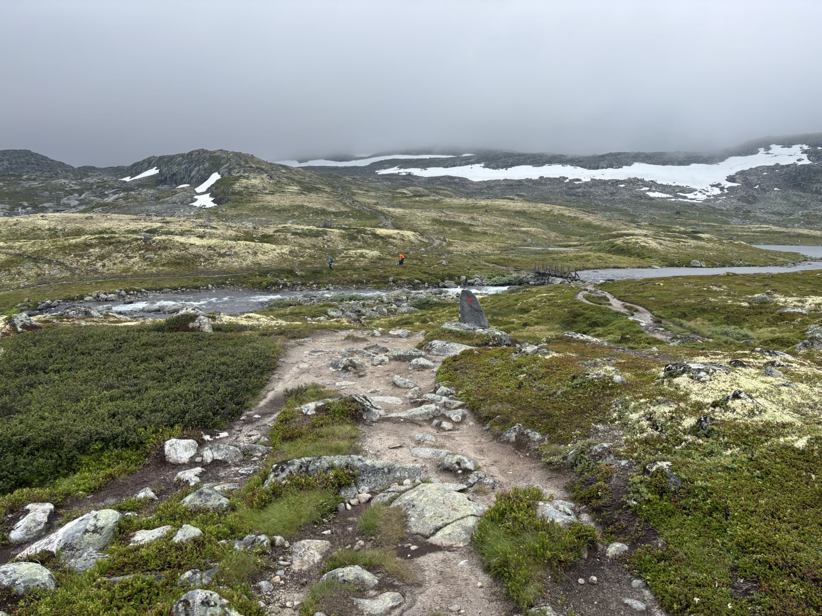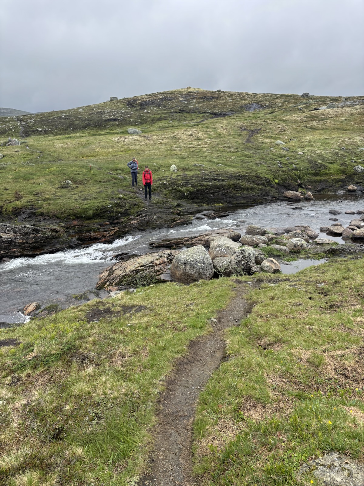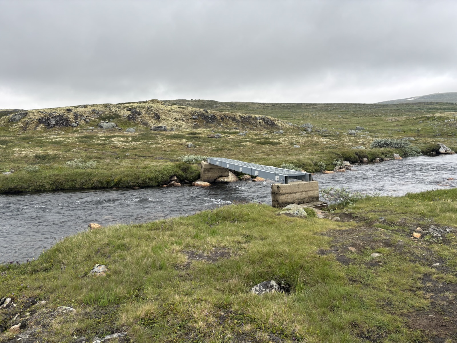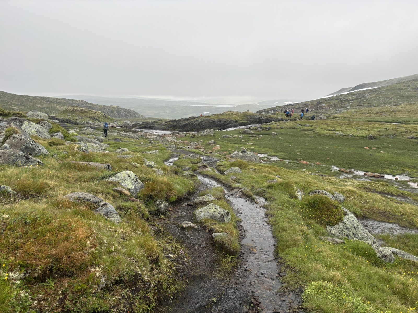 Hned ze začátku je stezka super, takový černý štěrk a rovina. Krajina už není kamenitá, spíš je všechno travnaté. A postupně se objevují různé bažinaté úseky. Takže suché nohy moc dlouho nevydrží. Tempo se taky mírně zpomaluje, ale pořád jdu blízko k 5 km/h.