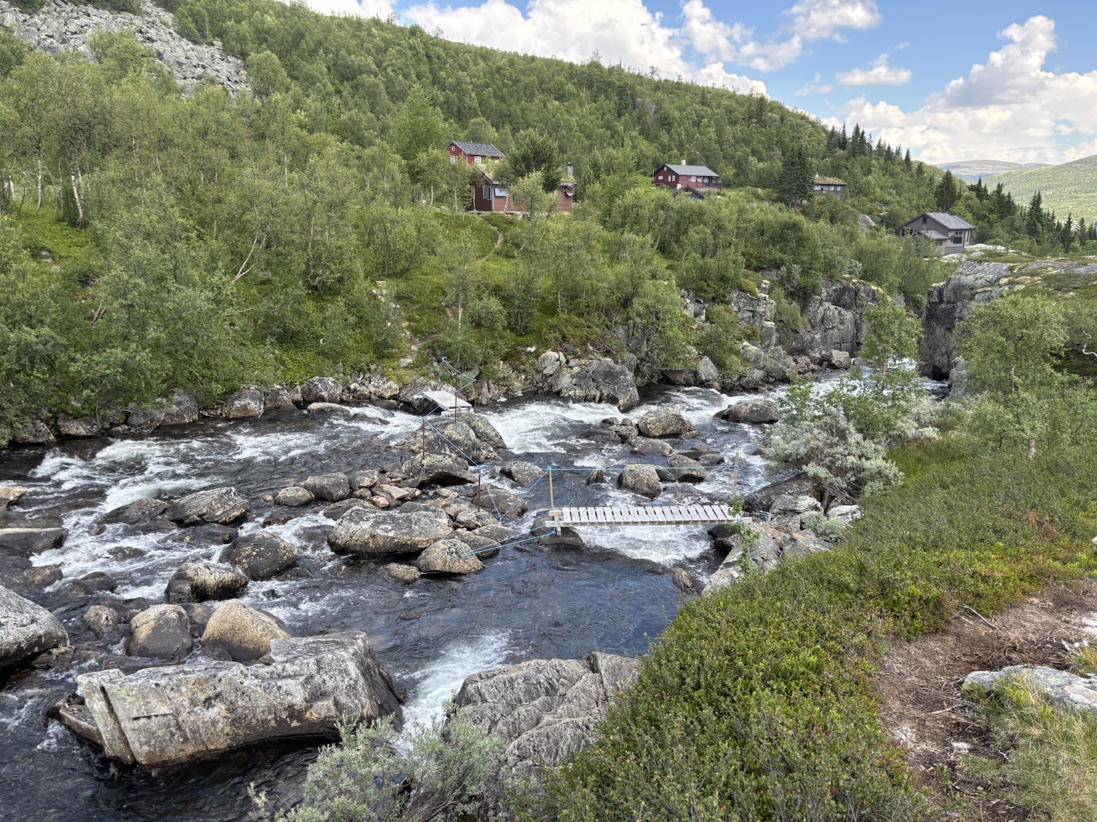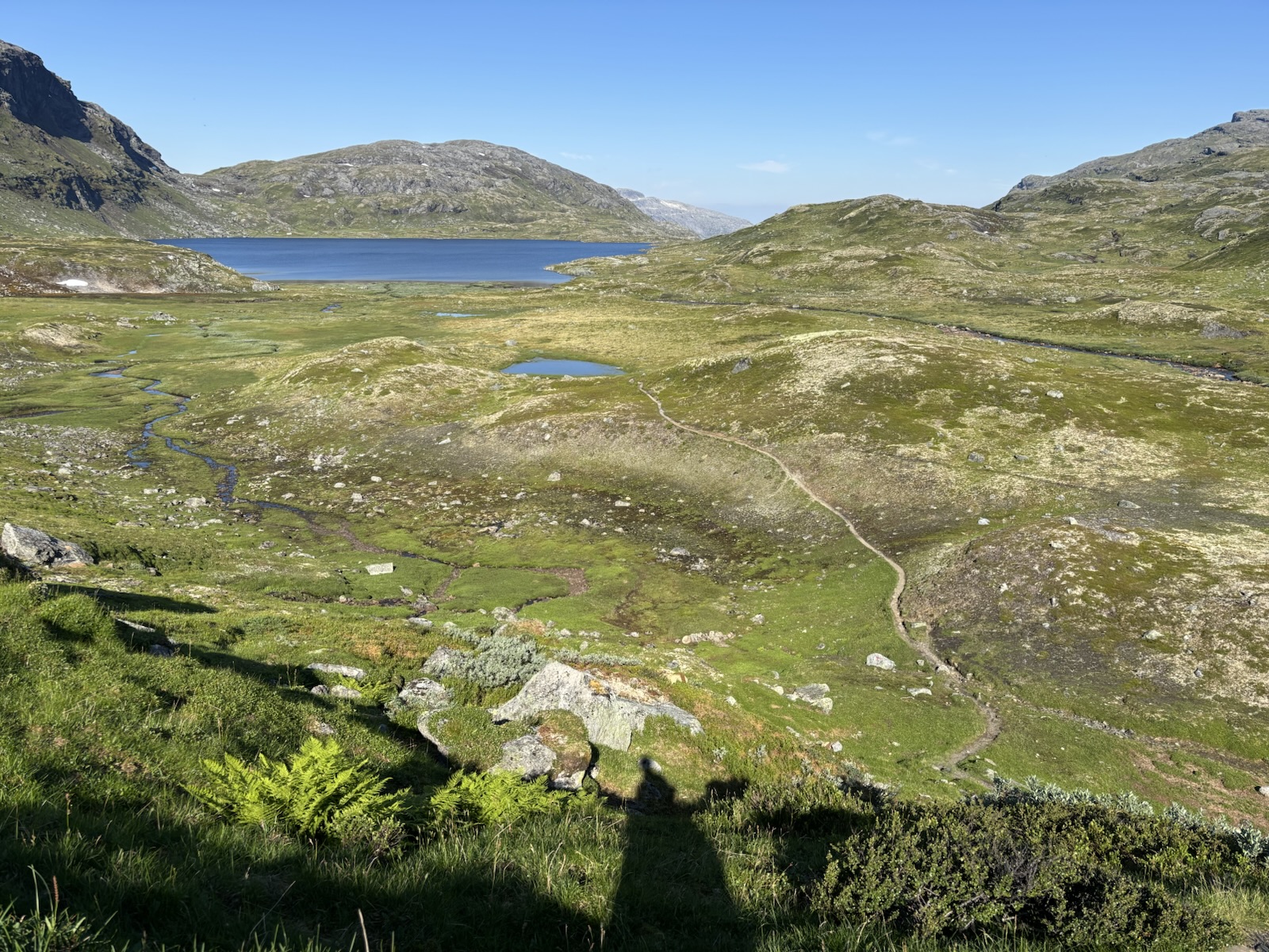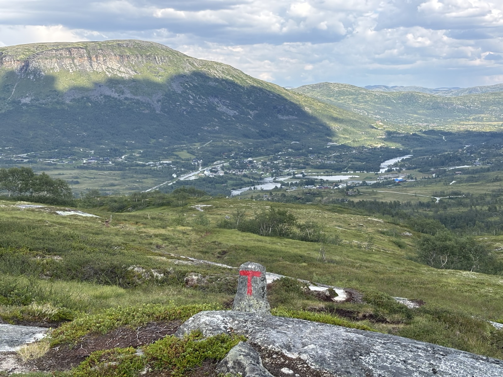 Když jsem nahoře, tak se mi otevře výhled do údolí, kam sestoupím. Je tam silnice, která křižuje park Hardangervidda, a vidím dost domů okolo, asi tam bude i nějaká vesnice.