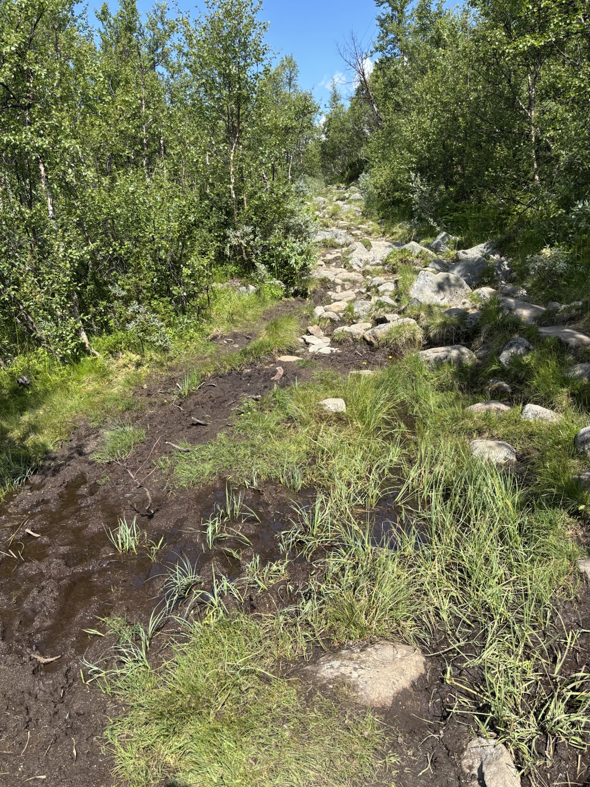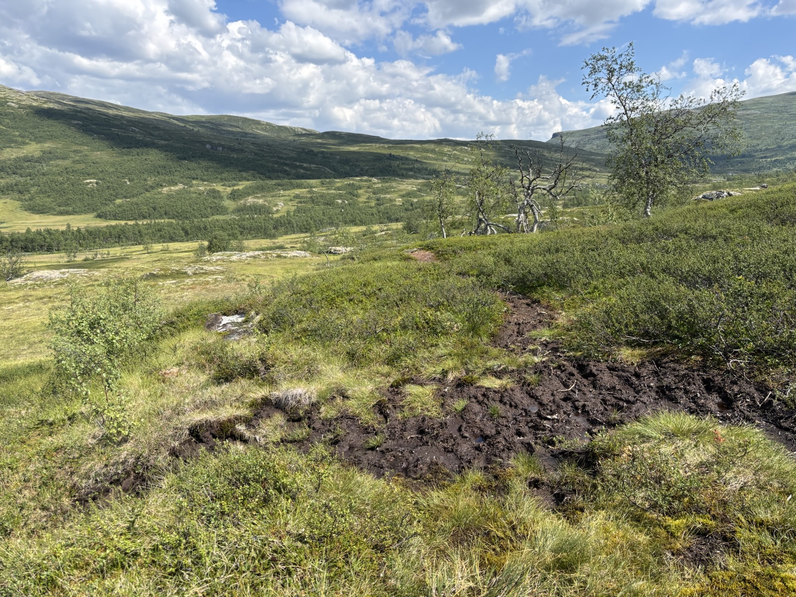 Prve mě čeká pár set metrů stoupání. Je to tu stále pěkné. Terén je pořád očekávatelný. Ale po pár hodinách začnu klesat do údolí, kde je hodně chatek a krajina je najednou jiná. Prve se trochu prodírám keříky a pak jsou tu dokonce stromy. A taky je tu dost mokro.