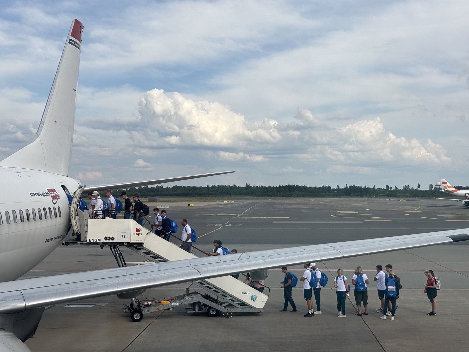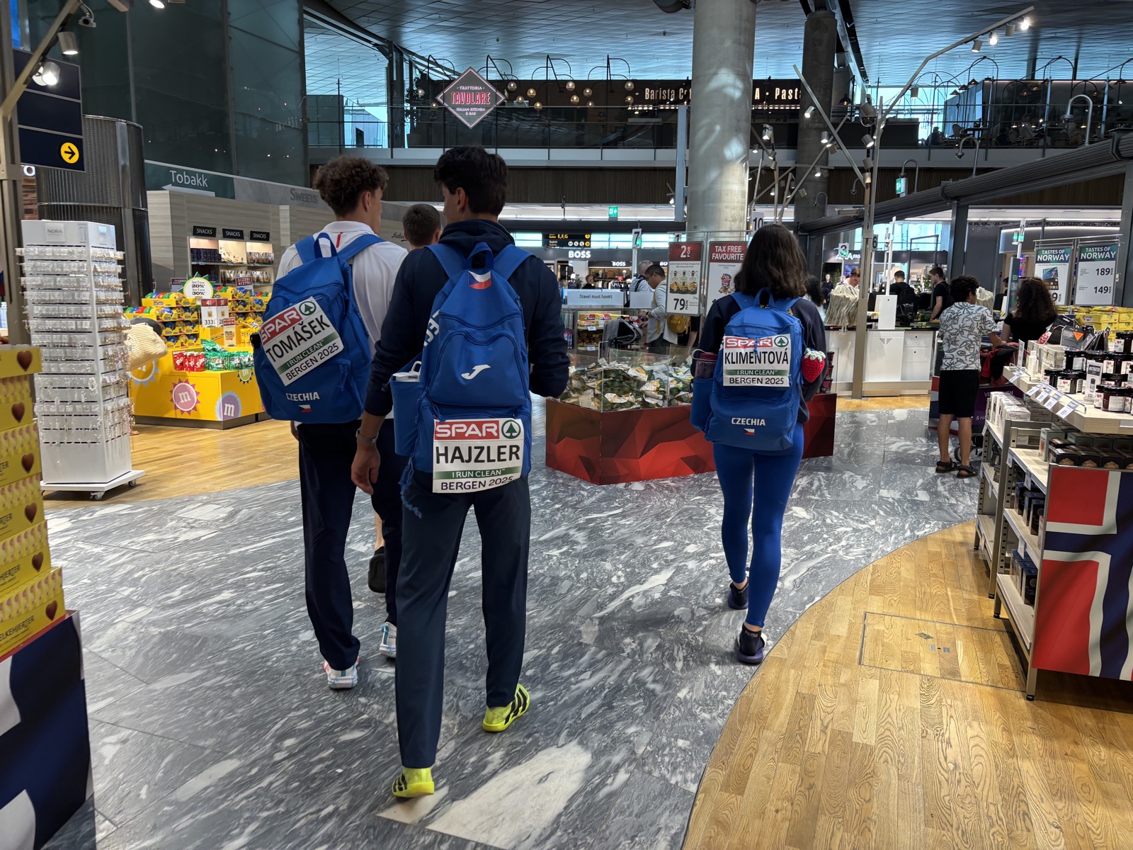 Na letiště se pohybuje spousta mladých Čechů s týmovými batůžky a na nich startovní čísla. Jsou to sportovci, kteří se účastnili mistrovství Evropy v atletice do 23 let v Bergenu. Jedna Češka dokonce vyhrála zlatou medaili v běhu na 100 m!