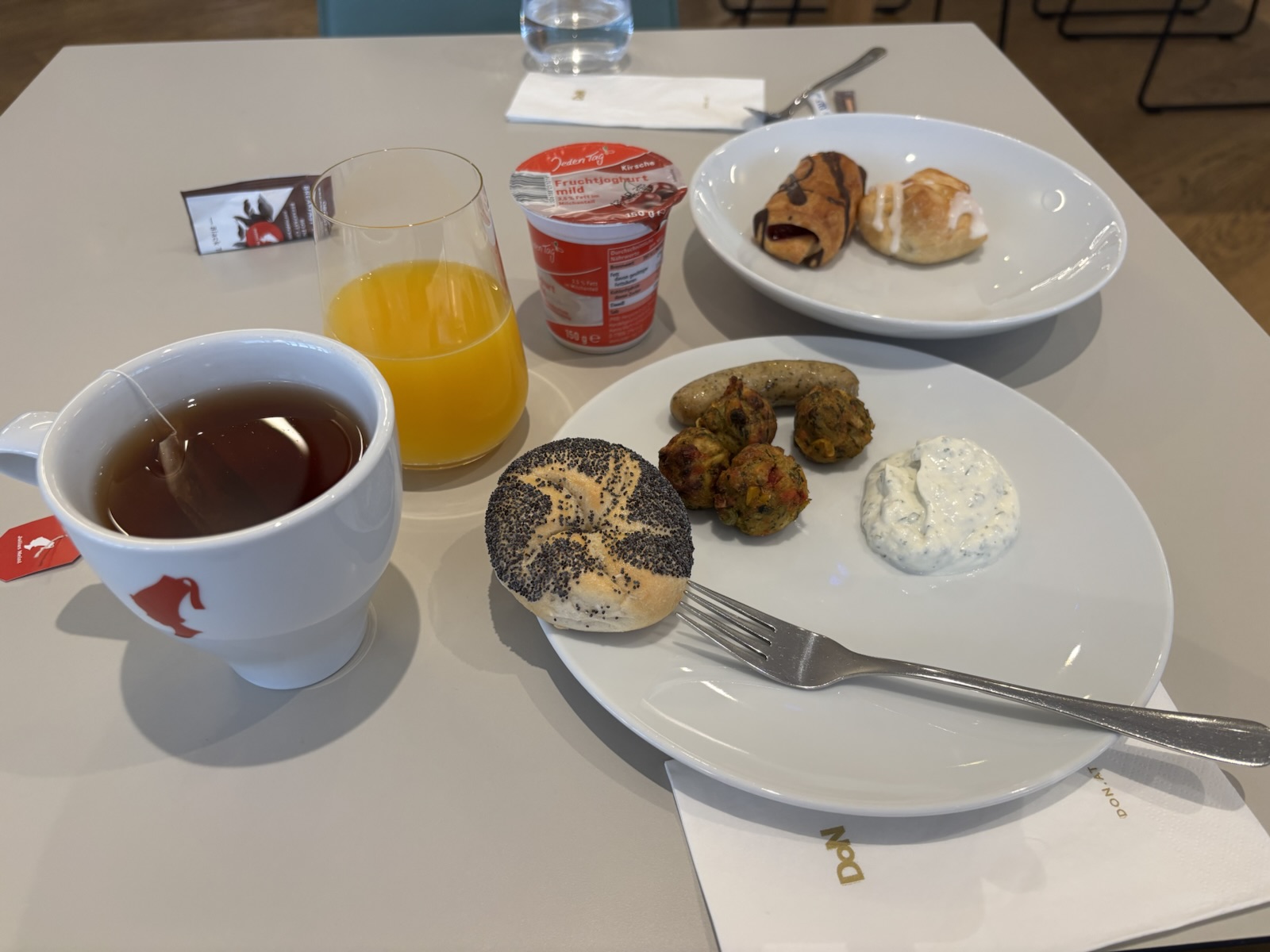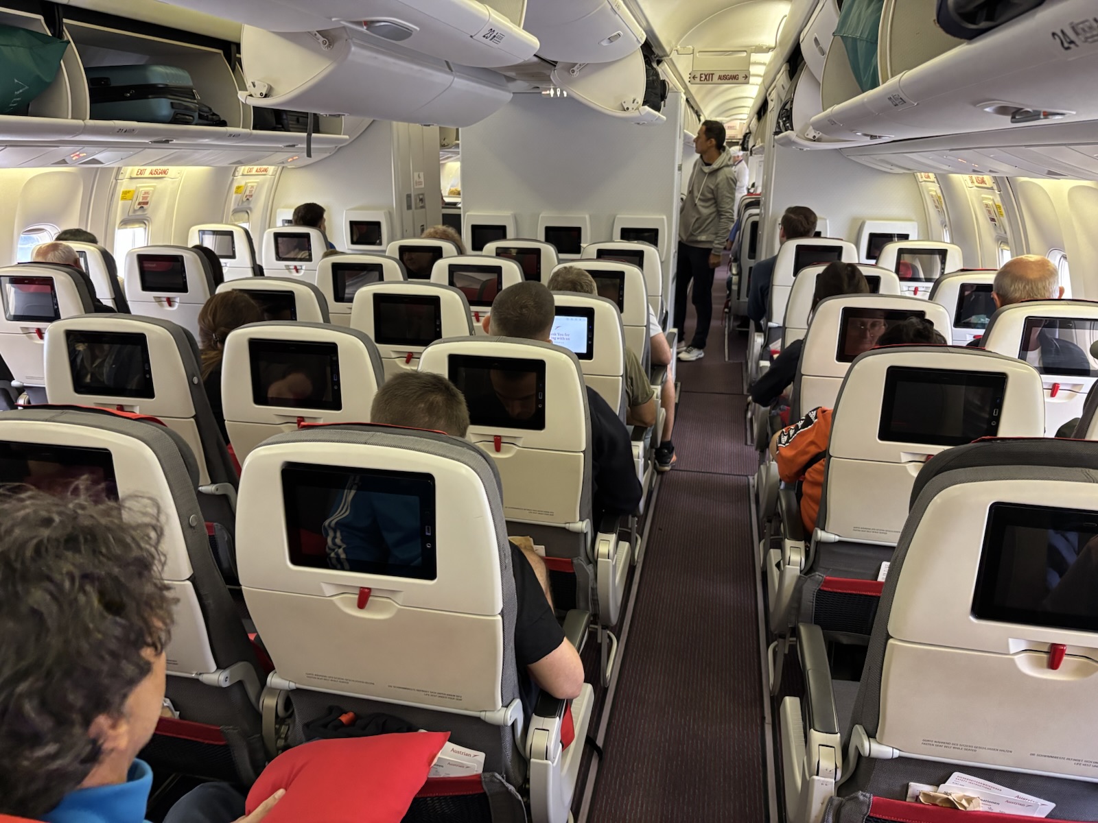 Každopádně bezpečnostní kontrola ve Vídni proběhla hladce. Jdu do salonku Vienna Lounge, kde mám přes Priority Pass vstup zdarma. Je to tu prostorné, není tu příliš velký ruch a mají docela dobré jídlo, takže jsem spokojený. Akorát škoda, že nemám víc času (na práci). Můj boarding má začínat v 9:55. Ještě si dávám rychle třetí čaj a v 10:00 valím ze salonku ke gejtu. Projdu automatickou bránou na kontrolu pasu a za chvíli jsem u D22. Nic jsem nezmeškal, ještě můžu jít v klidu na záchod a pak už pomalu jdu přes most do letadla. Letíme s Boeingem 767, to se moc nevidí. Je to wide body, ale celkem úzký, konfigurace 2-3-2. Včera při online check-inu na mě vyšlo místo 25H, což je sedadlo v uličce na krajní dvojce. To jde, hlavně když to není prostřední místo. A na spaní se hodí okýnko na opření, ale toto je denní let, takže ok.