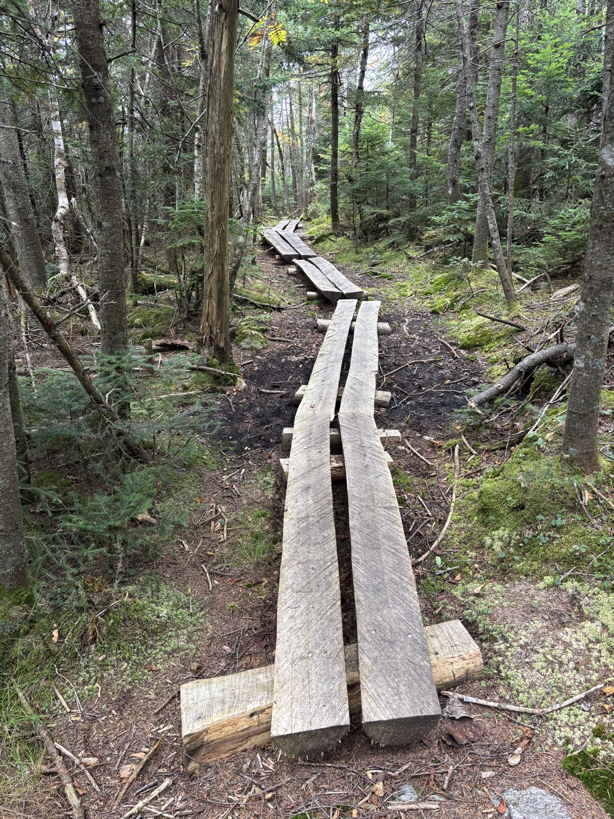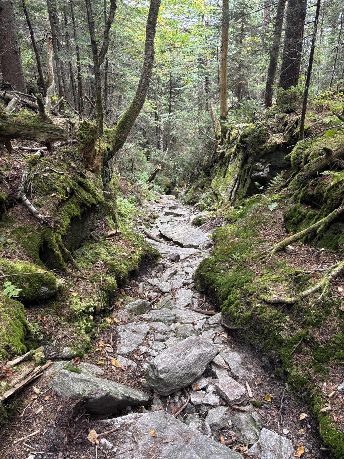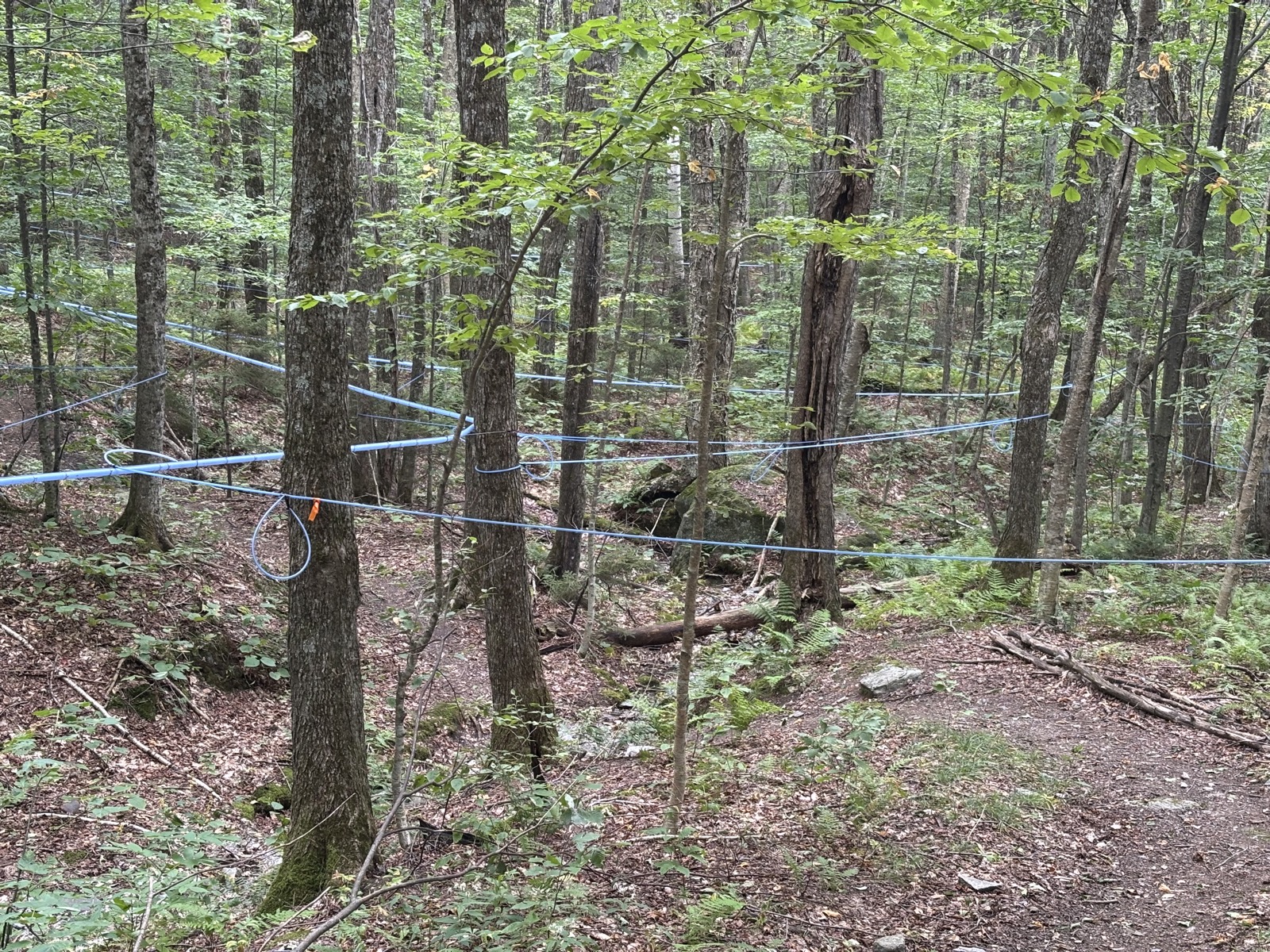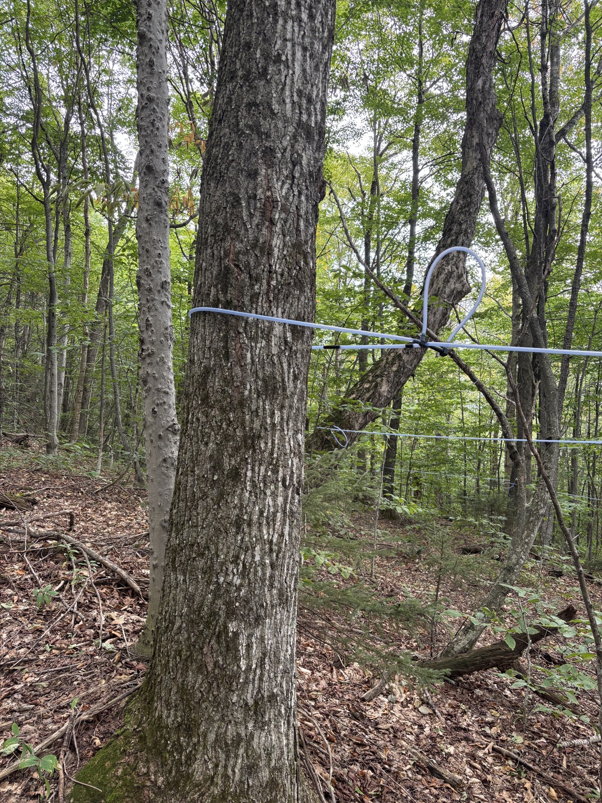 Klesám dolů kolem skal, je to hezké. V 1 přecházím prašnou cestu a zase stoupám vzhůru. Najednou se začnou objevovat hadice uvázané na stromech. Je to na sběr javorové šťávy!
