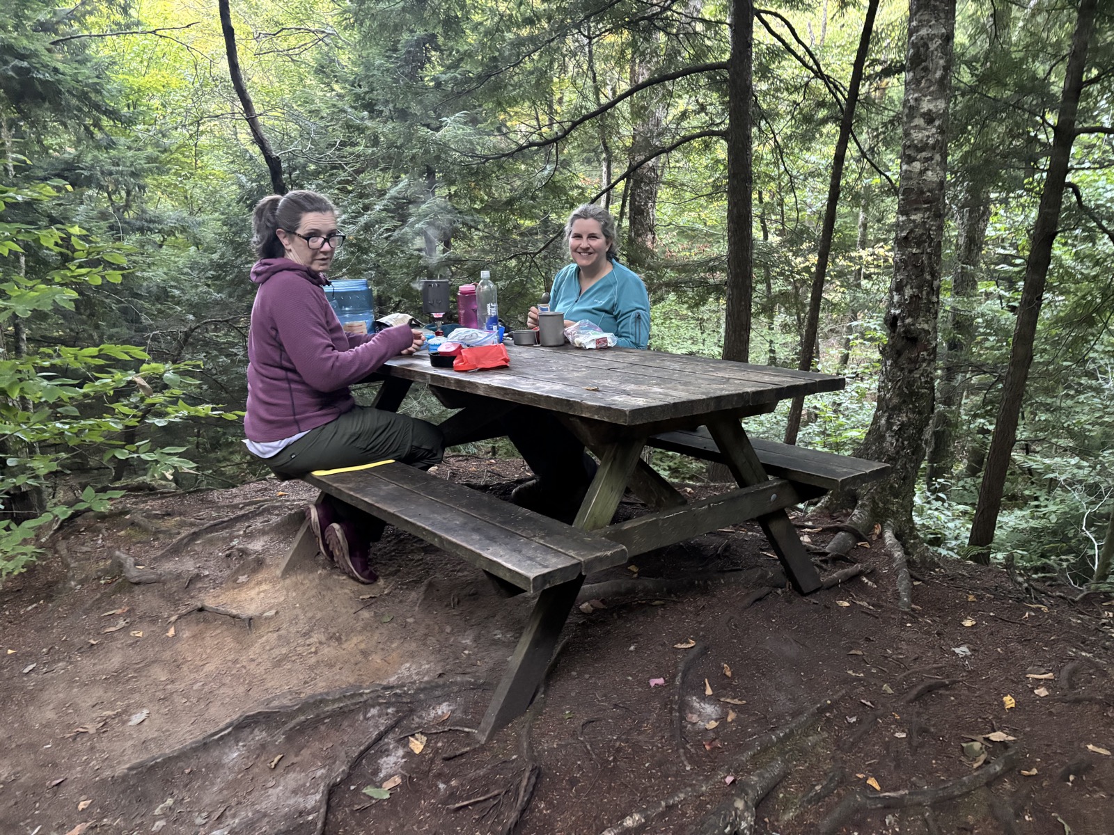 Čekám, až bude 6, ale jedna hikerka začne rachotit v 5:50, tak teda taky vstávám. Svítá.