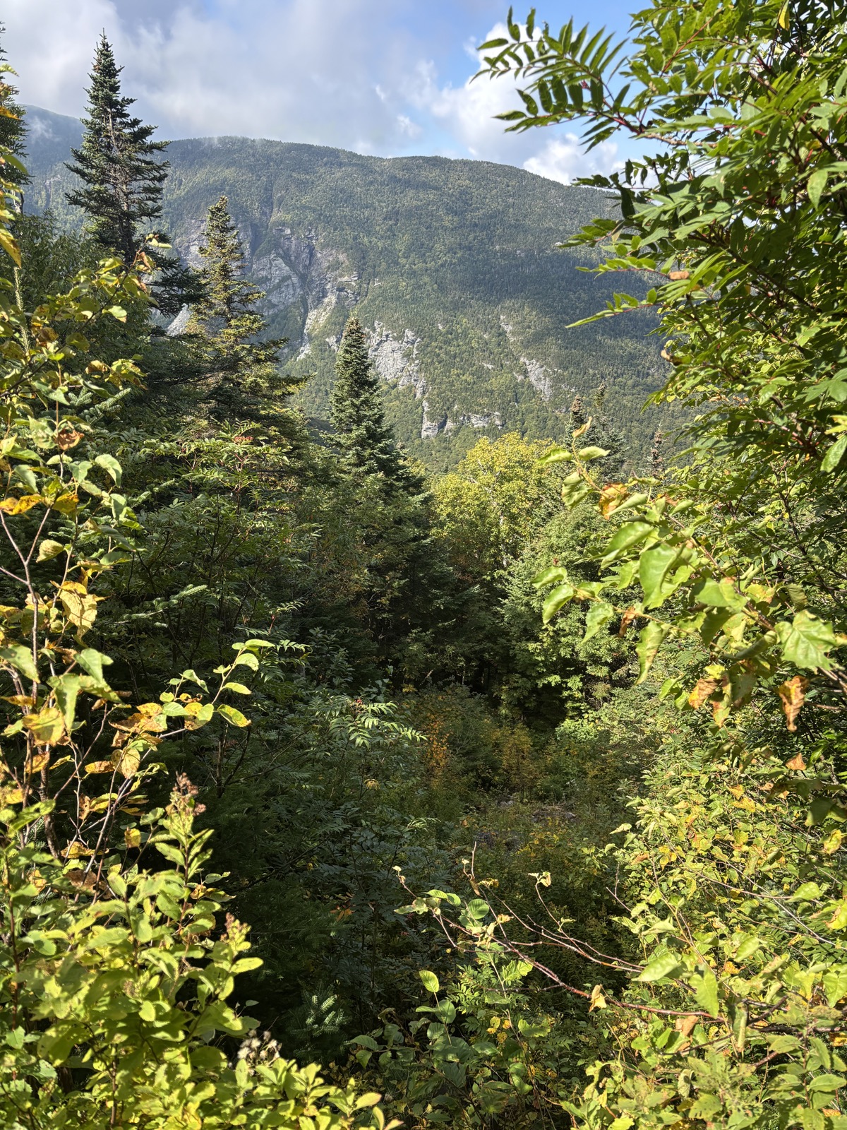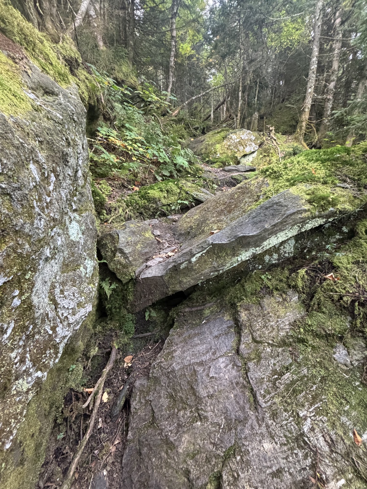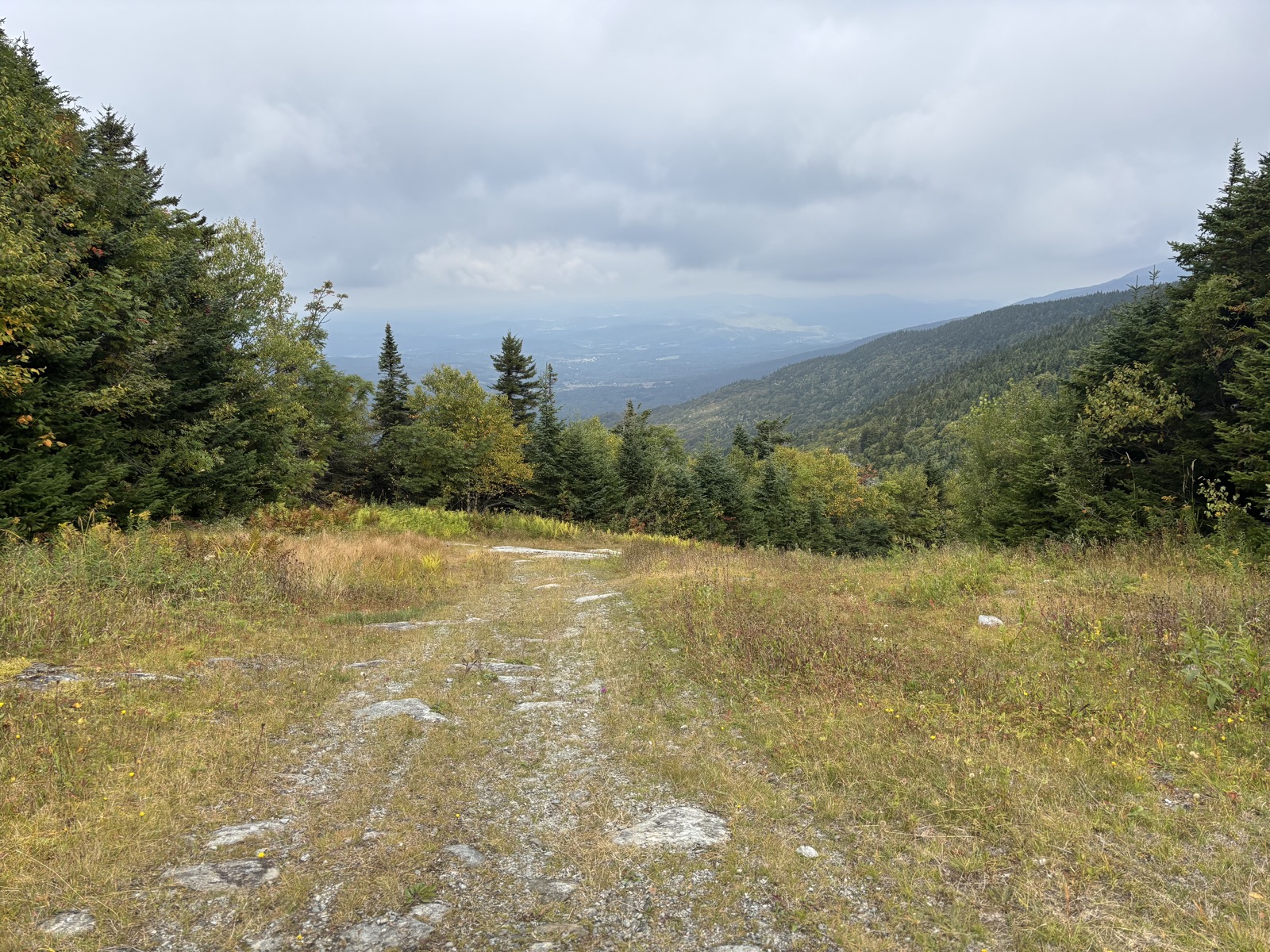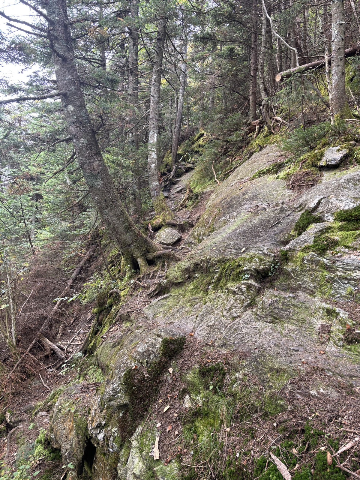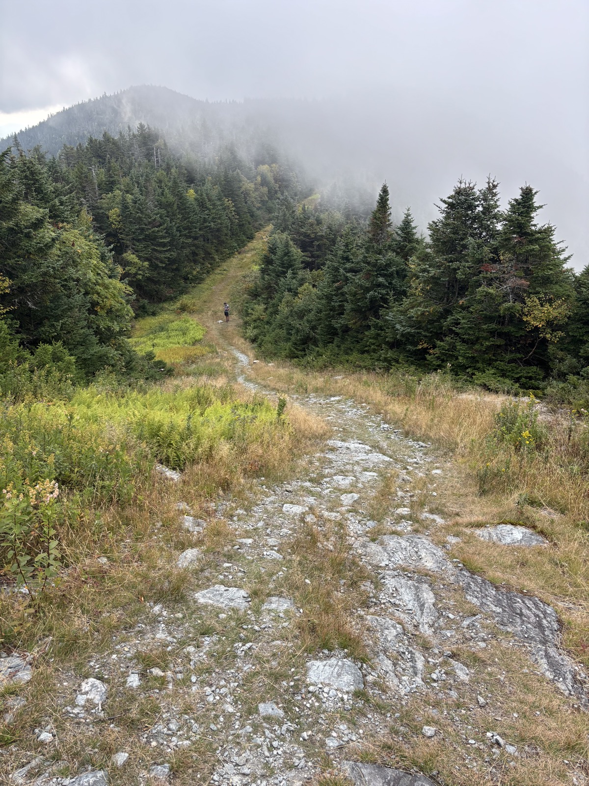 Stoupání vlastně není úplně souvislé, takže se to protáhne. Nahoře jsem v 8:26. Vrchol má 3715 stop! Je tu sice místo s výhledem, ale jsem v mraku, tak vidím prd. Nevadí. Prve trochu sestoupím a pak následuje ještě asi 85 m nahoru a pak ještě 140 m. Ale ve skutečnosti je to pak vždy víc, protože se vždy objeví nějaké vlnky.