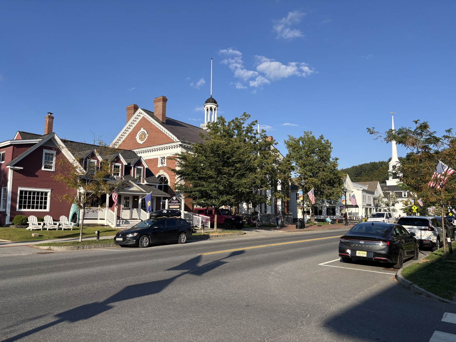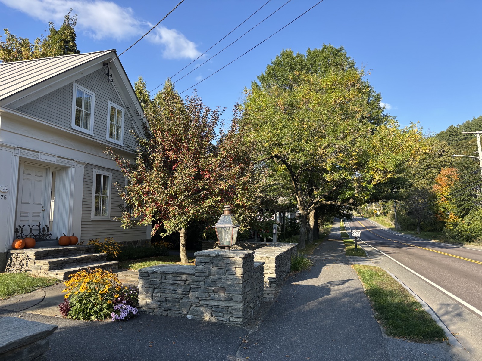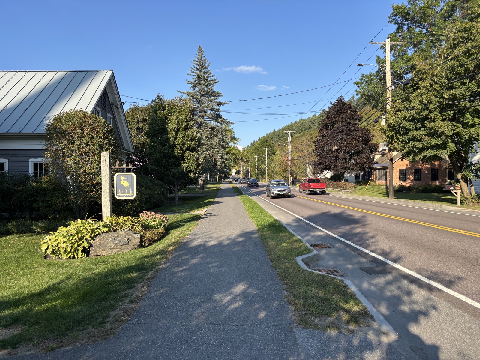 Teď už víceméně jen klesám a klesám, až ve 13:11 dojdu k silnici. Je tu nějaký hiker, tak kecáme, je kousek přede mnou – on zrovna dokoupil jídlo a pokračuje dál. A taky je tu dobrovolník, co pomáhá s trailem, a od něj dostanu broskev, je mňam! Ujistí mě, že v hotelu Green Mountain Inn dostanu slevu.