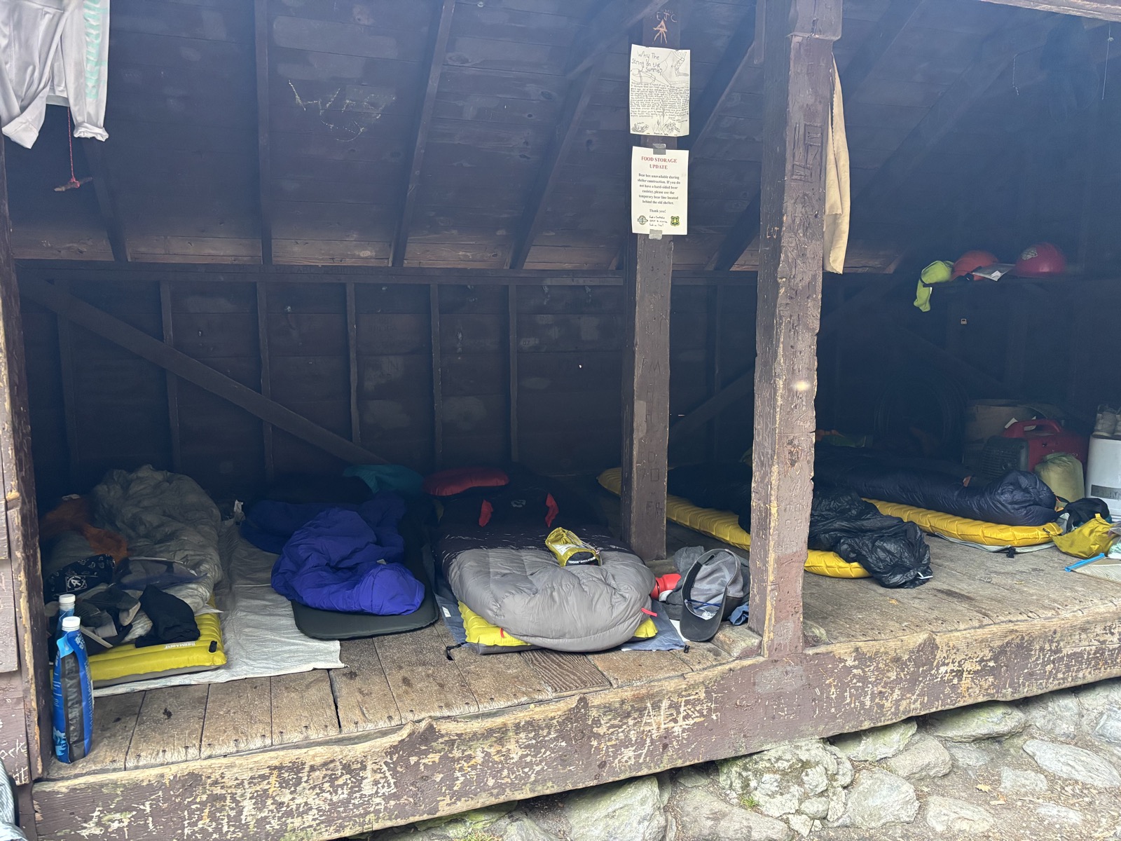 Pak jdu ještě přes pár vrcholů a když přejdu poslední, Mount Abraham, tak pak už jen klesnu dolů k přístřešku Battell. Jsem tu v 17:18. Už je tu víc hikerů a taky 3 lidé, co tu staví nový přístřešek. Tito 3 naštěstí spí o kus vedle ve svém stanu. Ale i tak tu bude dnes plno. Ještě přijdou další. Nakonec nás je v přístřešku 6, plná kapacita. A dva pozdní příchozí museli spát venku. Jdeme spát zhruba v 8 jako obvykle.