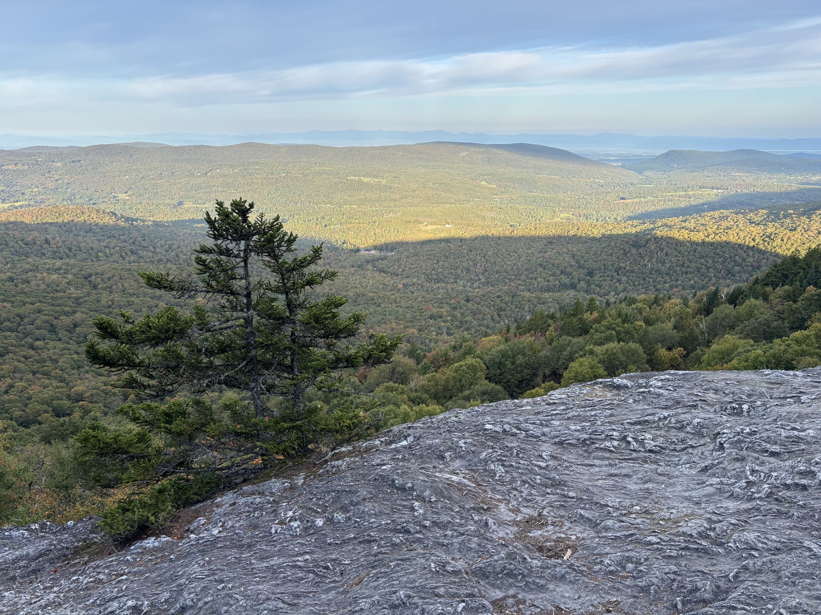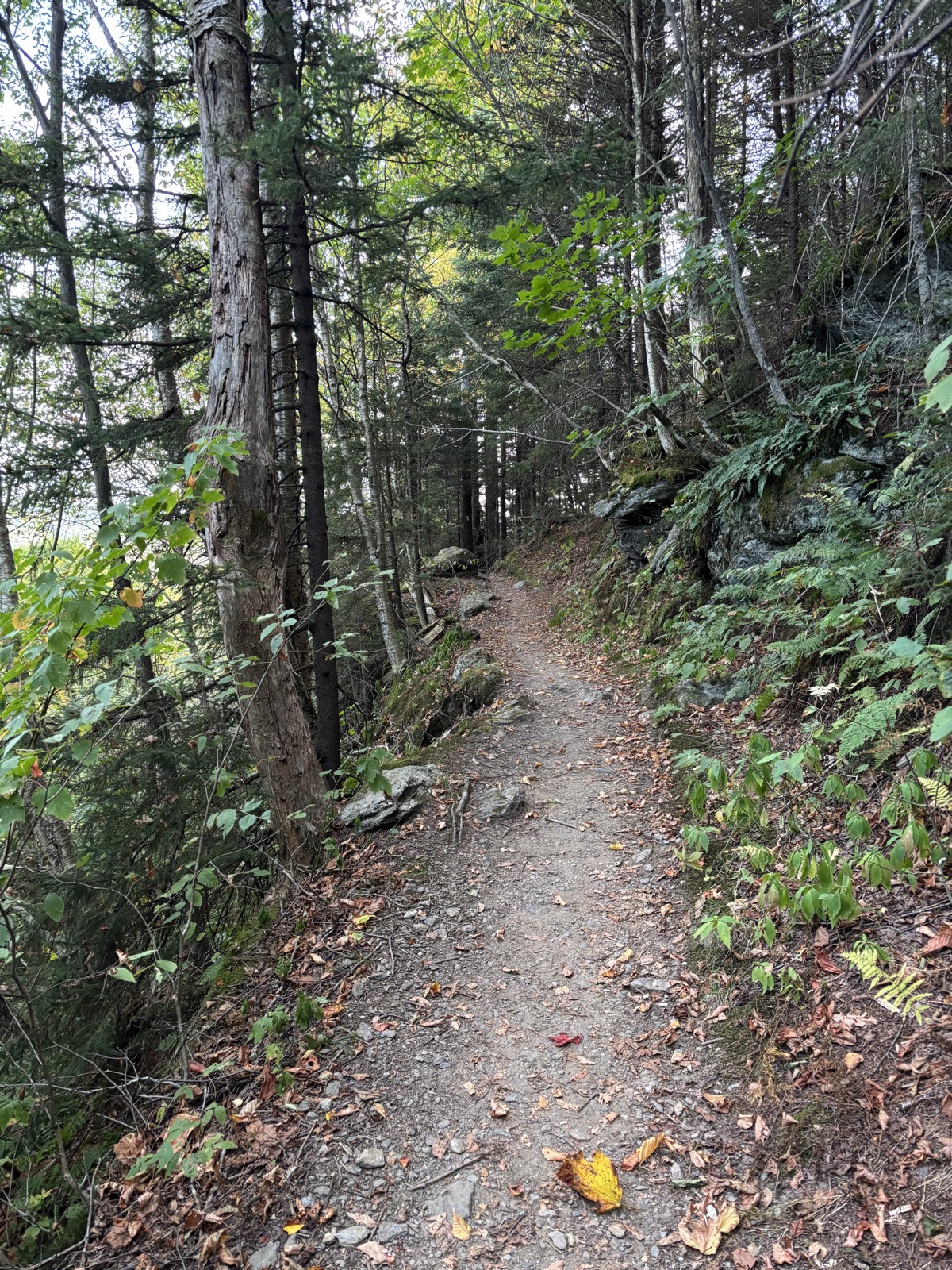 Začíná stoupání. Prve 400 m a pak se to celé dopoledne různě houpe. Třeba 100 m nahoru, 150 m dolů a tak různě pořád dokola. Je to únavné. Moc mi to nejde. A stezka je navíc hodně zarostlá a je to takový celkem škaredý les nízkých smrků. Aspoň že nahoře byly nějaké výhledy. Ale jen zkraje, pak už ne.