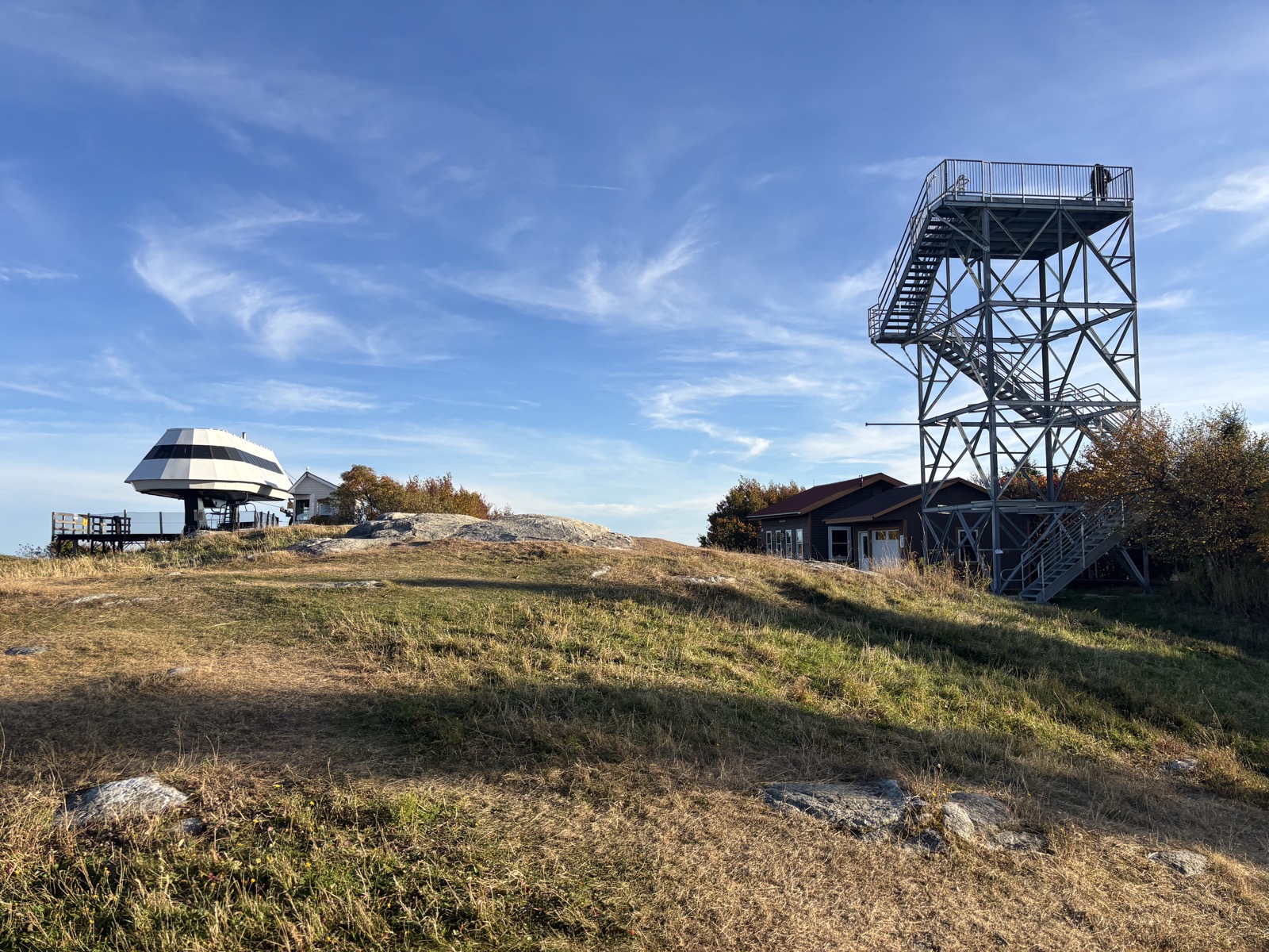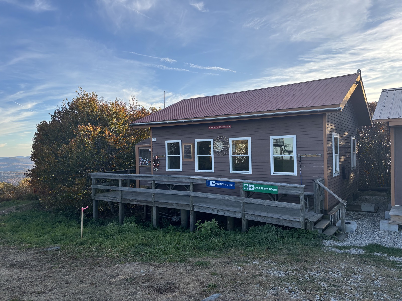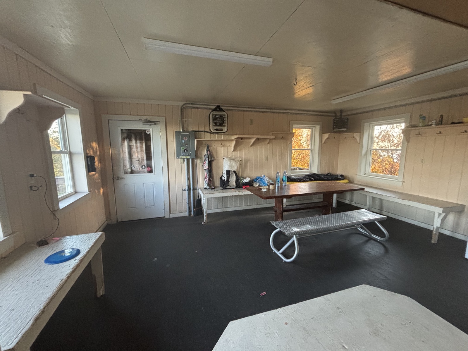 Je to od silnice asi 270 m stoupání. Docela se to táhne. Nahoře jsem v 16:42. Původní plán byl jen si tu trochu dobít mobil a pokračovat dál. Jenže jak zkoumám mapu, tak to přehodnotím. Další přístřešek je jen míli daleko, to nemá cenu, to je lepší být v zavřené místnosti zde, i s elektřinou. Další přístřešek je skoro 9 km daleko. Za světla bych tam stihl dojít, ale možná nemusím jít zase nadoraz. Sice tím možná ohrozím to, že dojdu trail za 13 dní, ale co.