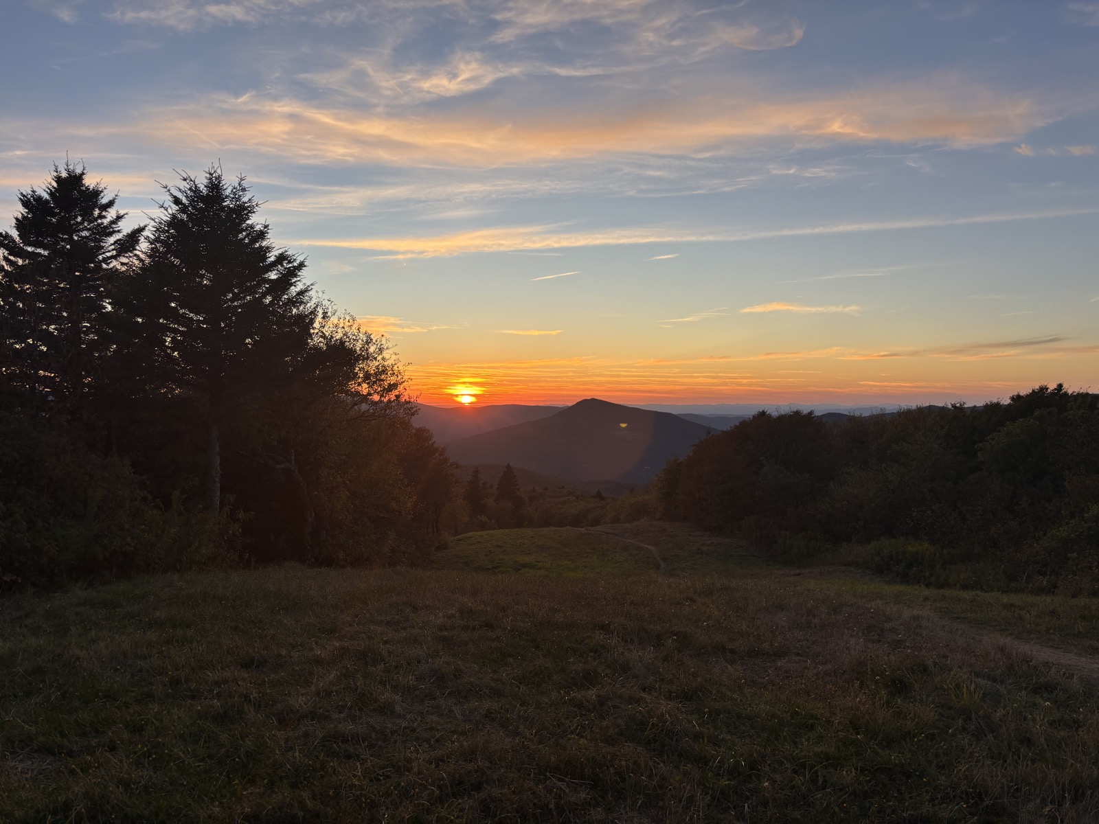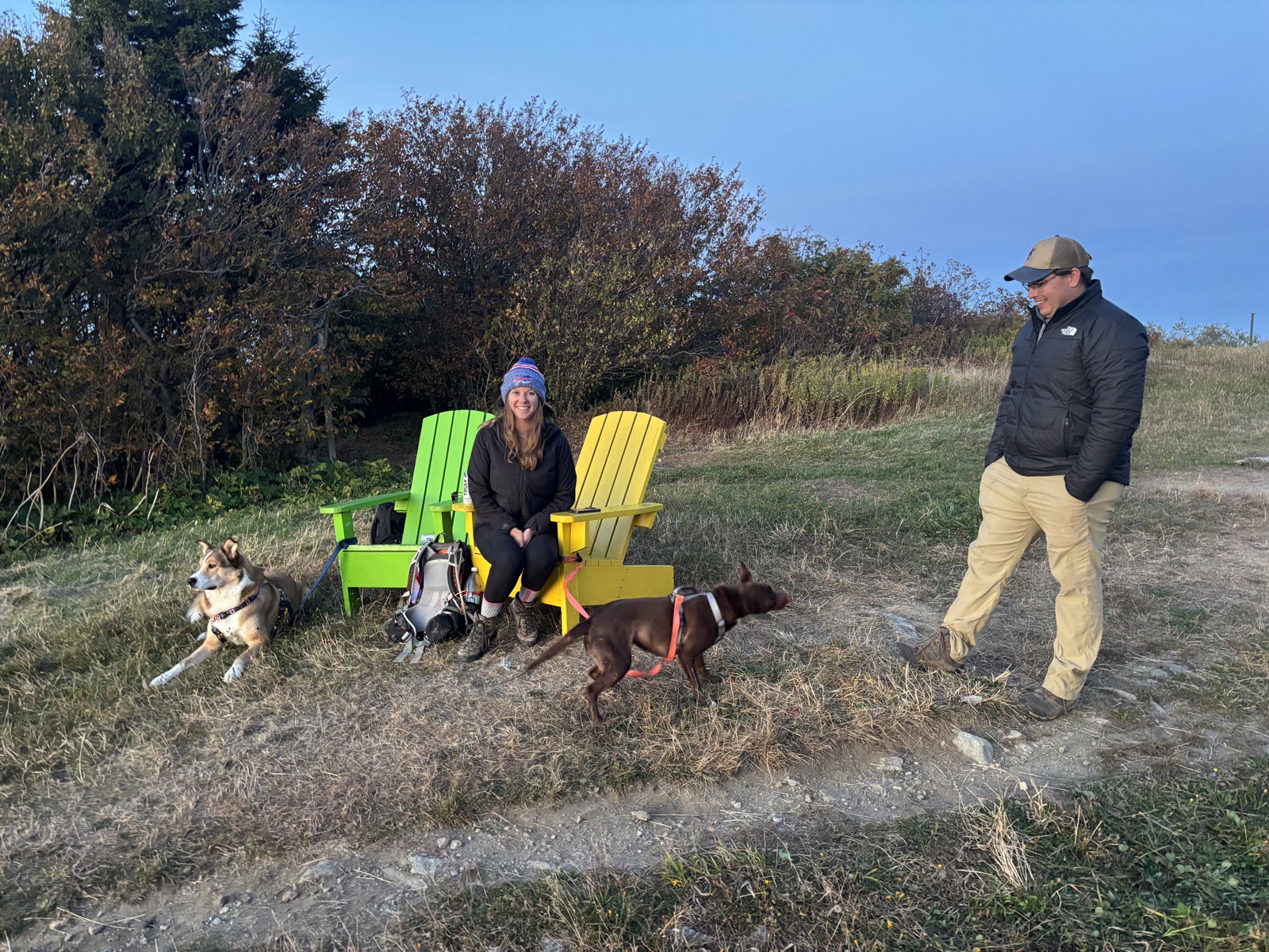 Pak ještě něco dělám uvnitř a v 18:40 vyjdu ven sledovat západ slunce. Bude za 10 minut. Pár se psy se mezitím přesunul na strategické místo, kde bude nejlepší výhled. Jdu za nima a pak kecáme až je skoro tma. Jsou z Benningtonu, 30 minut autem odsud, a chodí sem prý zhruba jednou týdně. Bavíme se o různých trailech a tak.