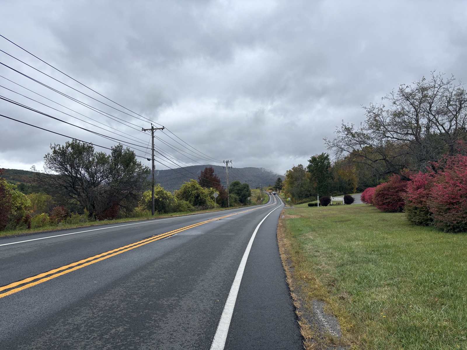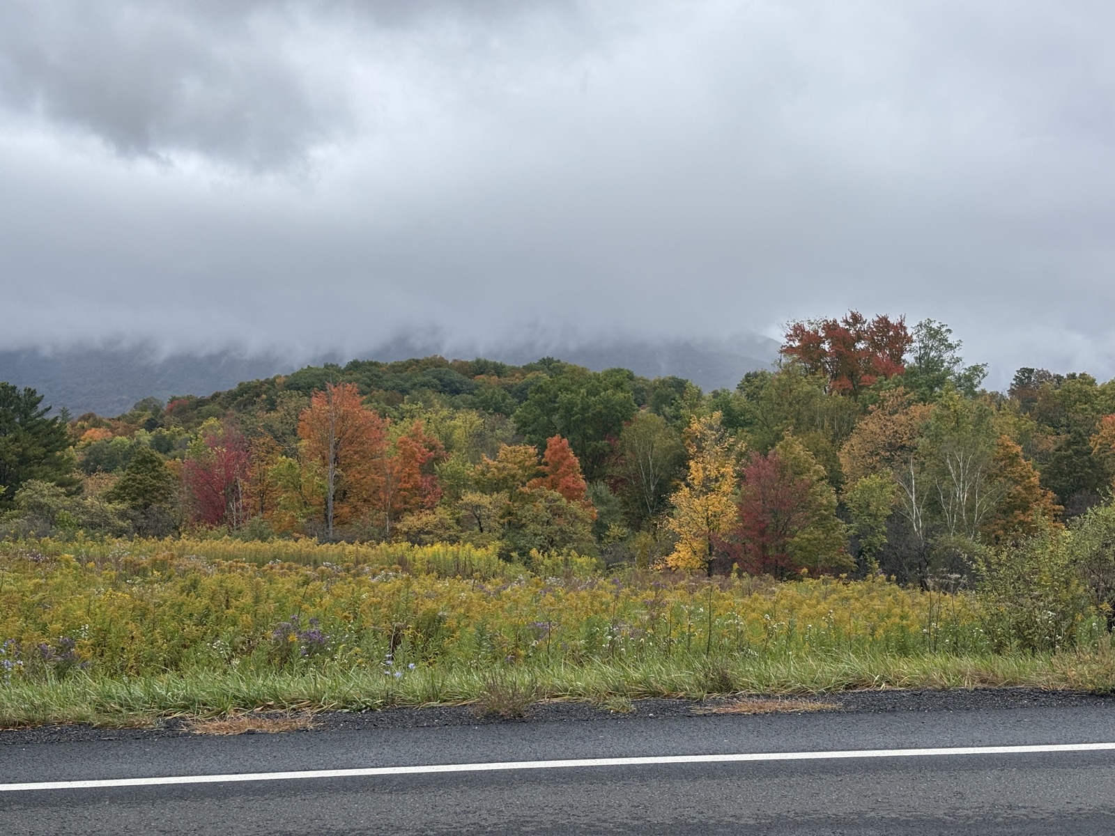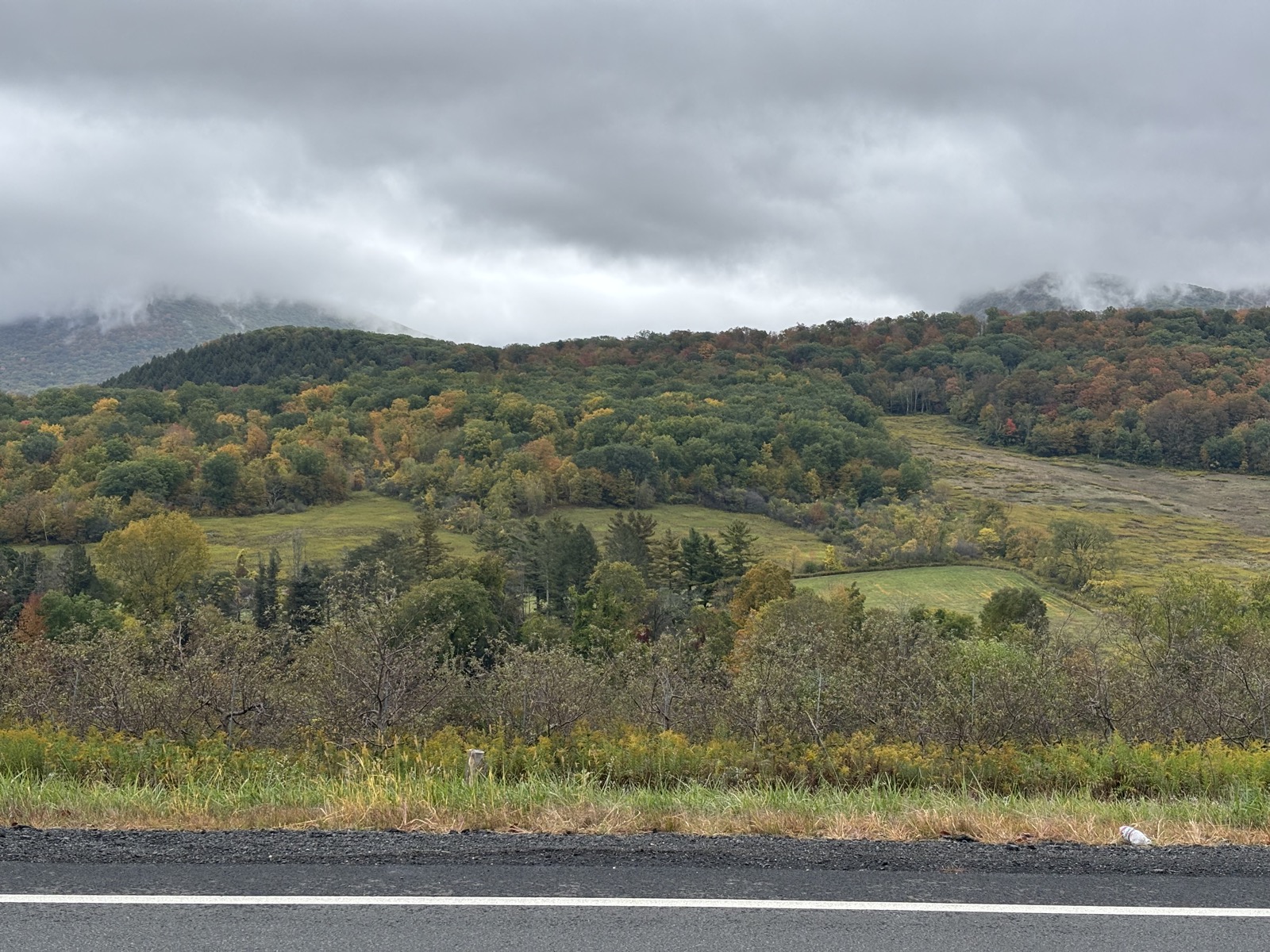 Ve 14:21 tedy pokračuju pěšky dál. Počasí je pořád celkem milosrdné, chvilku i trochu mrholilo, ale pak přestalo. Jak jdu po silnici, tak mám možná nejlepší výhledy na kopečky a lesy za celý výlet. Všechno se hezky barví.